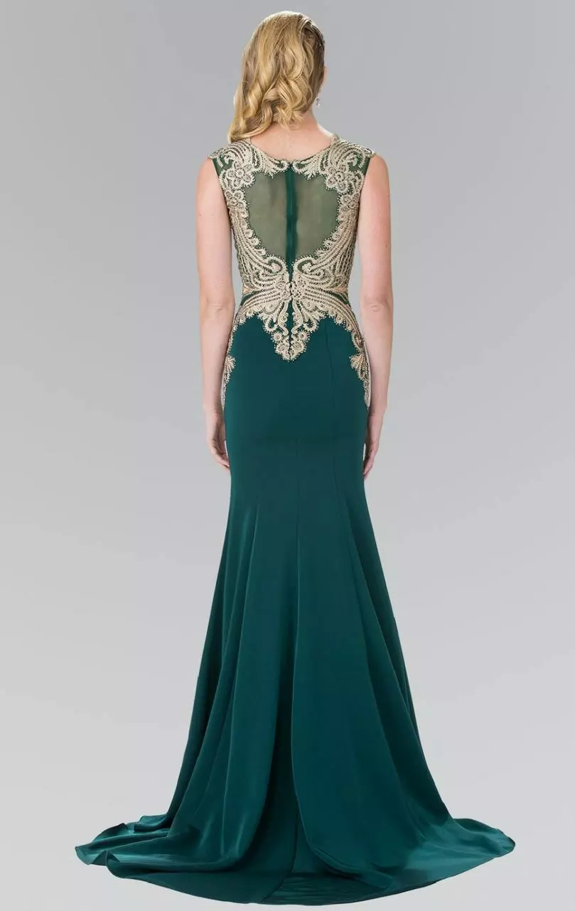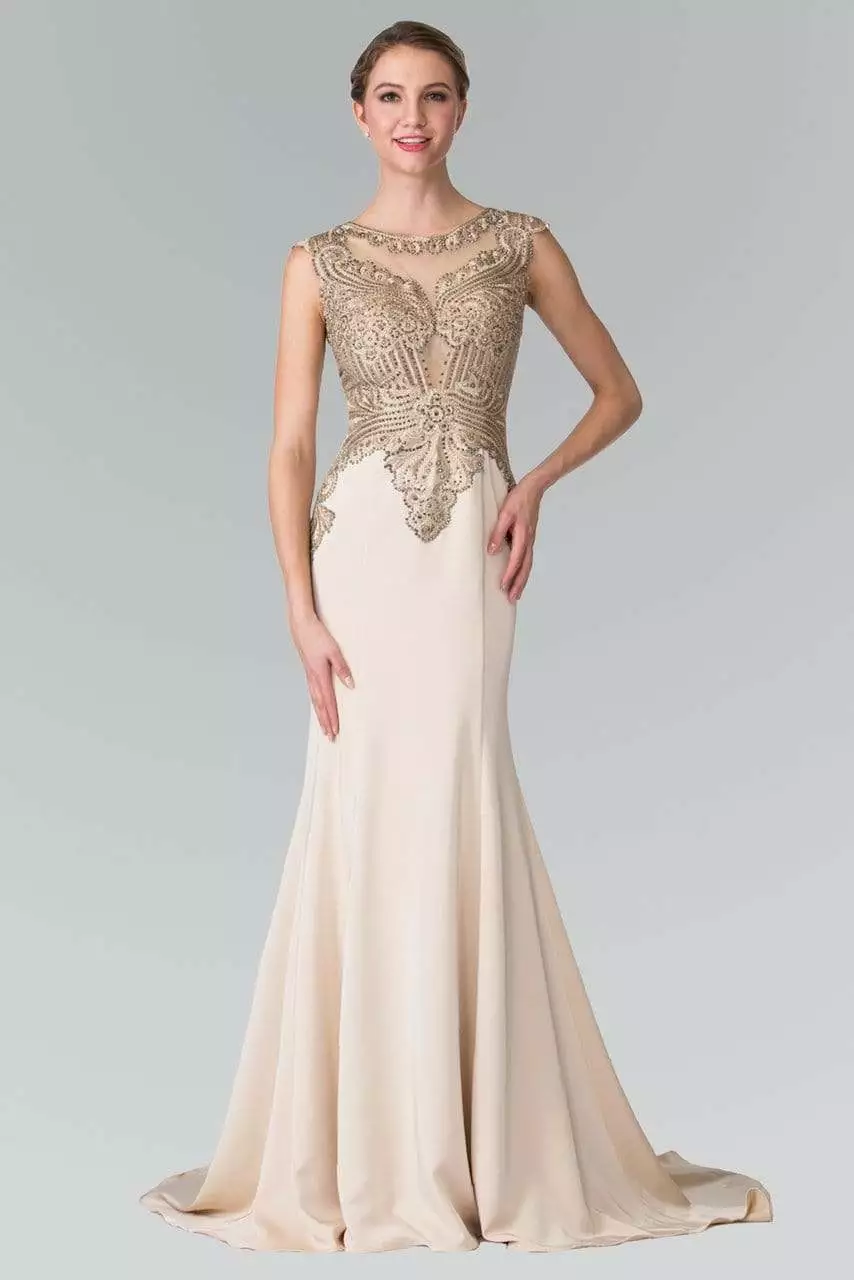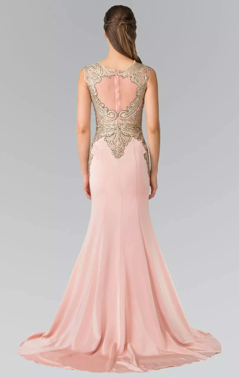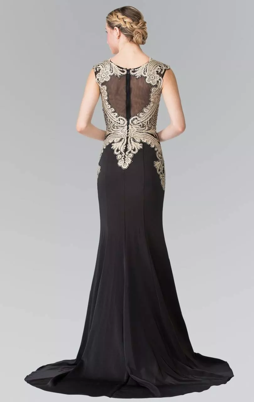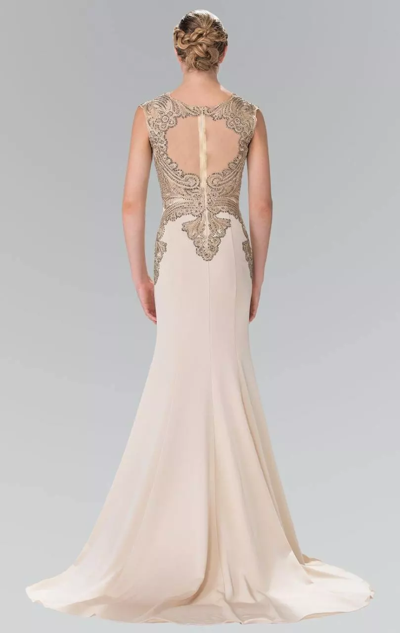 Look fabulous in this exciting evening dress Elizabeth K GL1461. The beautifully adorned bodice features an amazingly embroidered gold toned pattern lined with twinkling beads intricately appliqued all over the fitted bodice to create a stunning design. The enchanting illusion open back details flutters and flows to the full-length hem, finished with a decadent draped train. This jersey column gown by Elizabeth K is perfect for a standout attention.