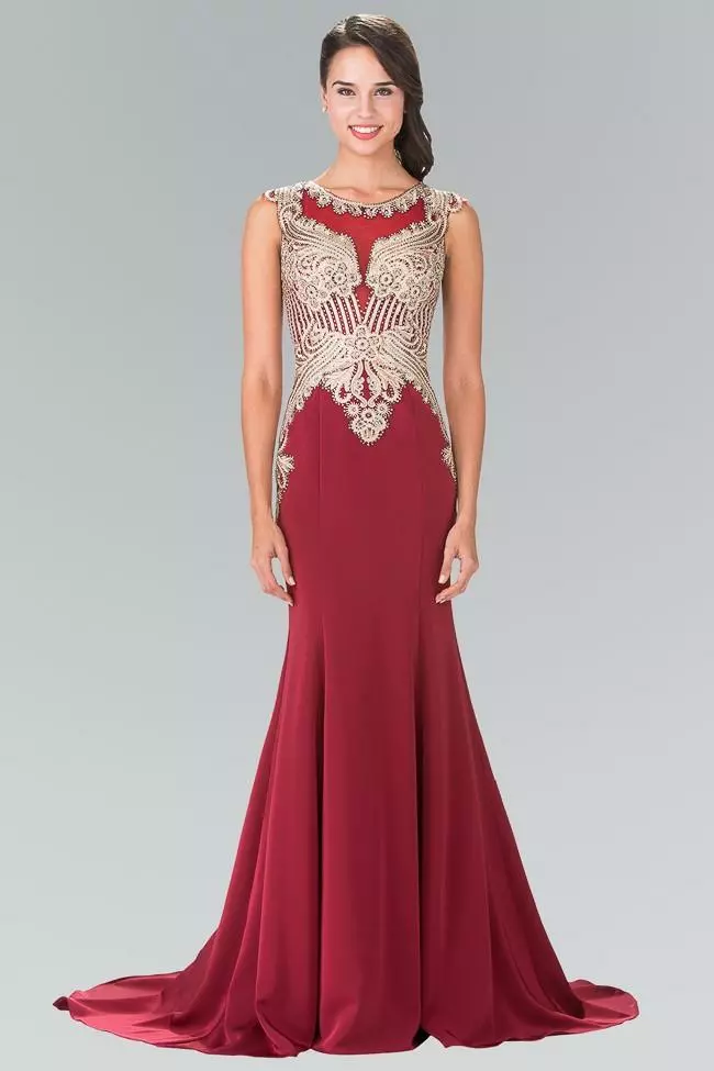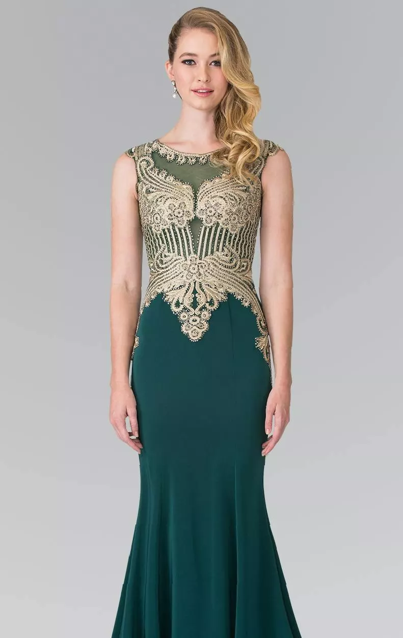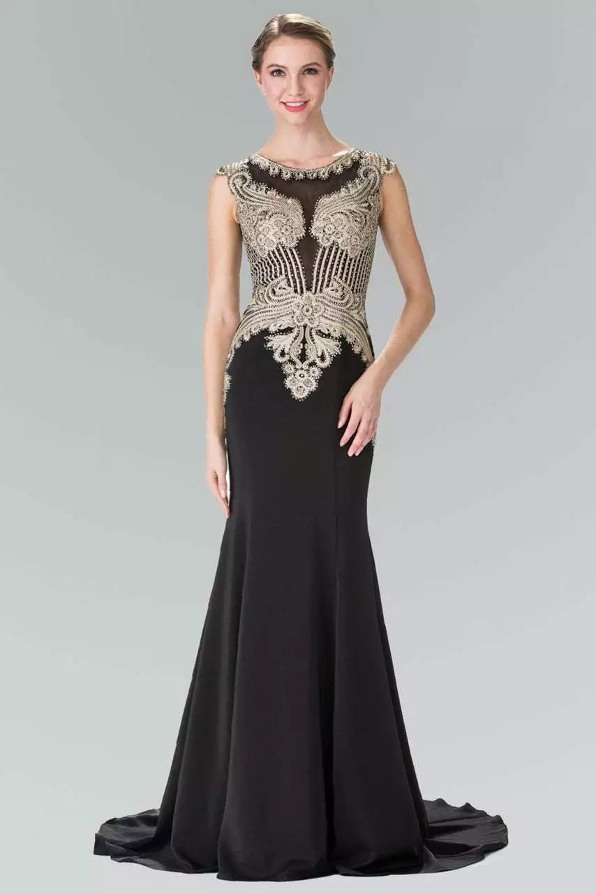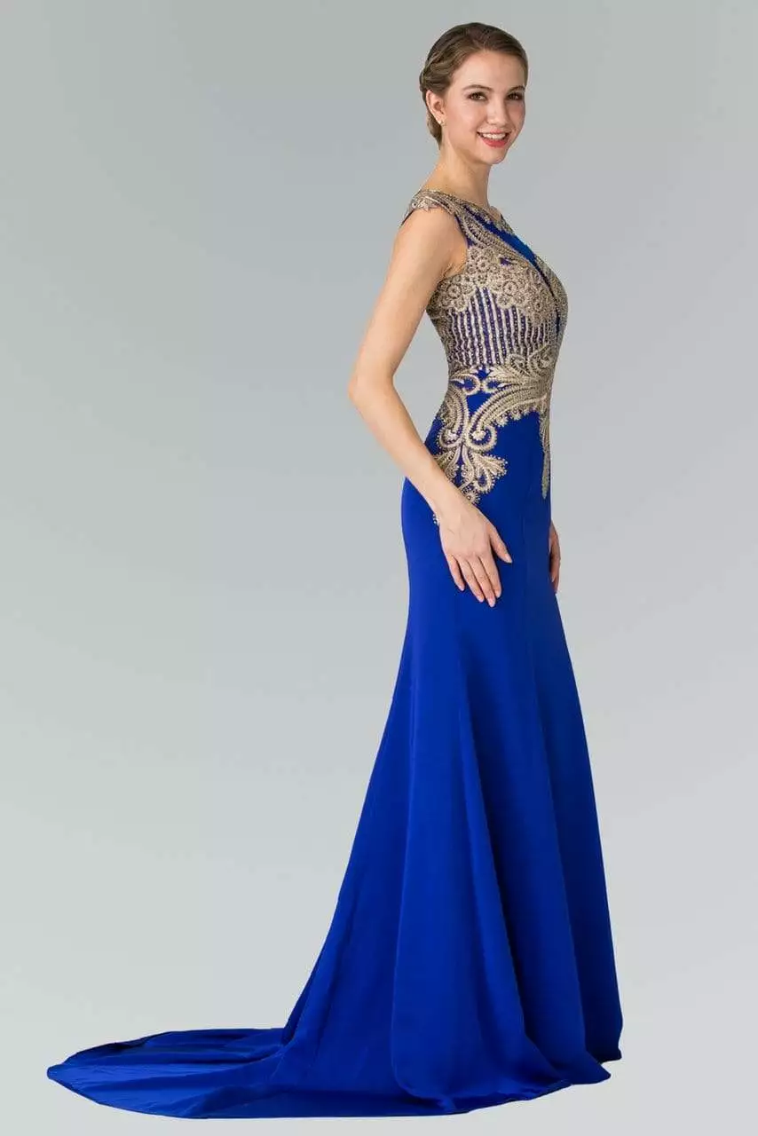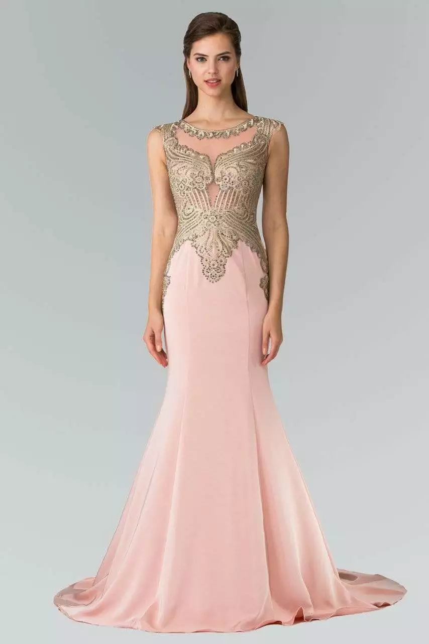 Look fabulous in this exciting evening dress Elizabeth K GL1461. The beautifully adorned bodice features an amazingly embroidered gold toned pattern lined with twinkling beads intricately appliqued all over the fitted bodice to create a stunning design. The enchanting illusion open back details flutters and flows to the full-length hem, finished with a decadent draped train. This jersey column gown by Elizabeth K is perfect for a standout attention.