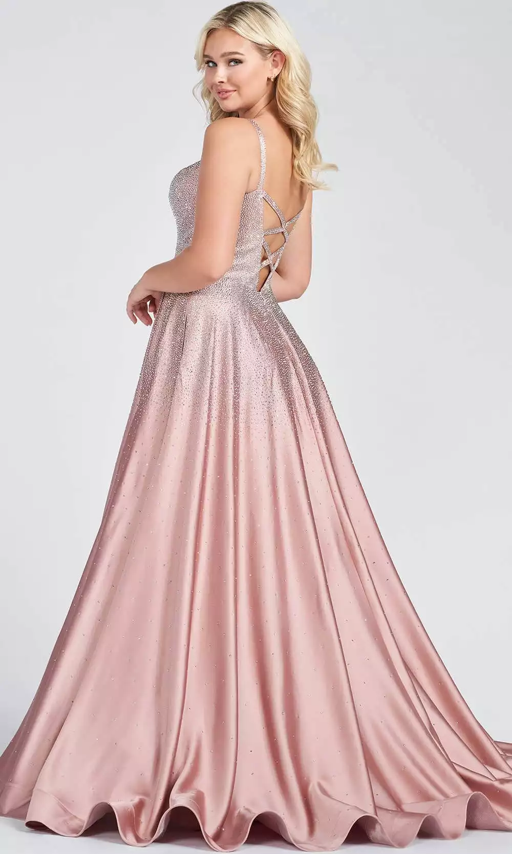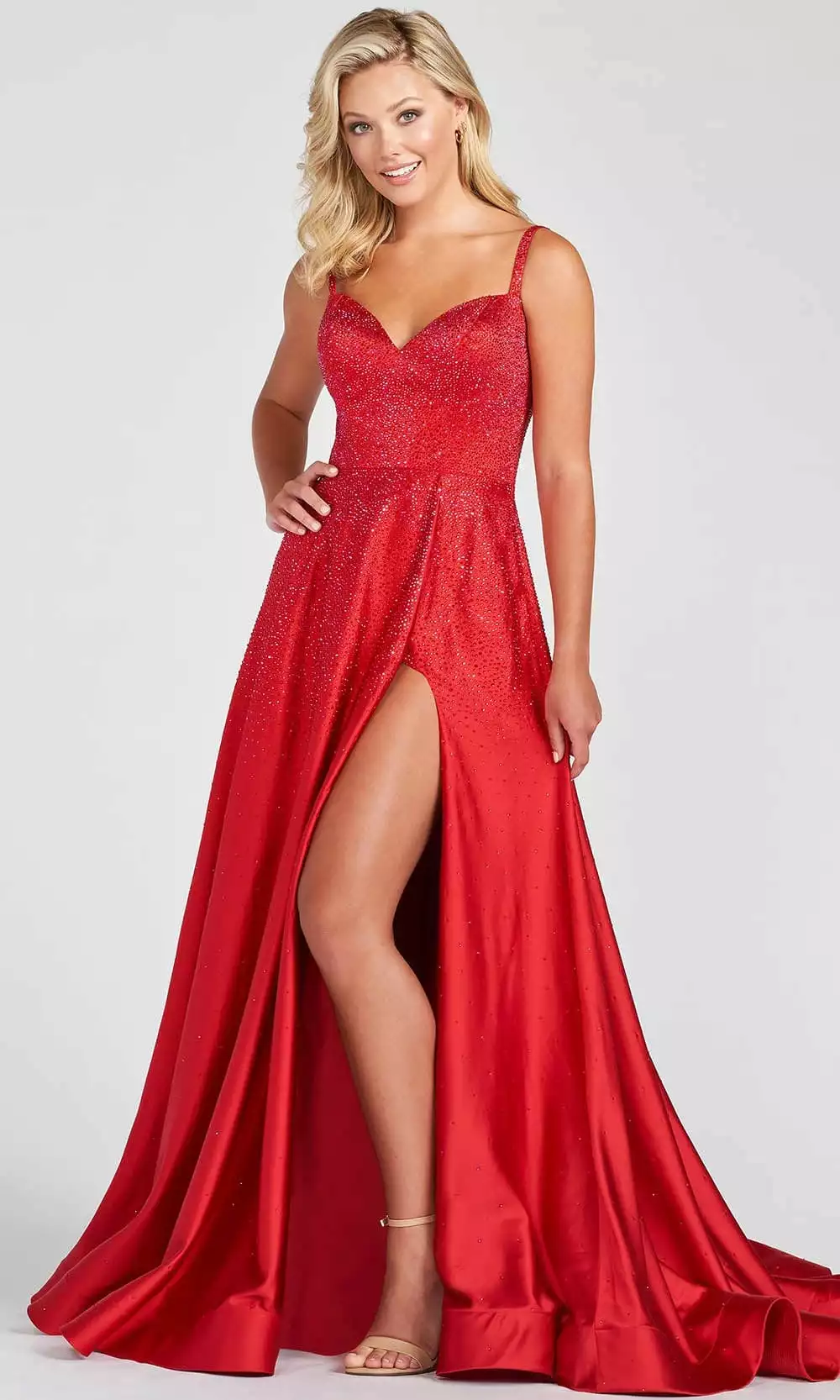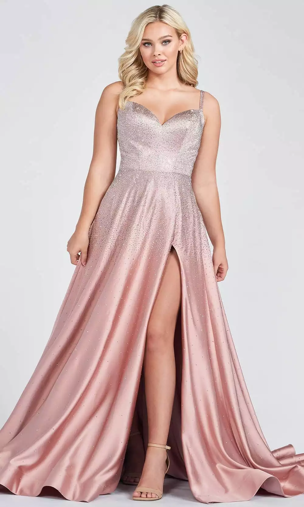 Parade a grace that is stylishly romantic in this Ellie Wilde EW122015 creation. Sprinkled with heat set stones in a soft satin silhouette, this gorgeous piece flaunts a sweetheart neckline supported with thin straps. Detailed with crisscross straps on a deep v-open back, a high slit opens the A-line skirt as it flows into a train. Make every moment count in this Ellie Wilde masterpiece. Whether your style is modern trendy or timeless classic, Mon Cheri will clothe with poise, elegance and grace for your momentous occasion.