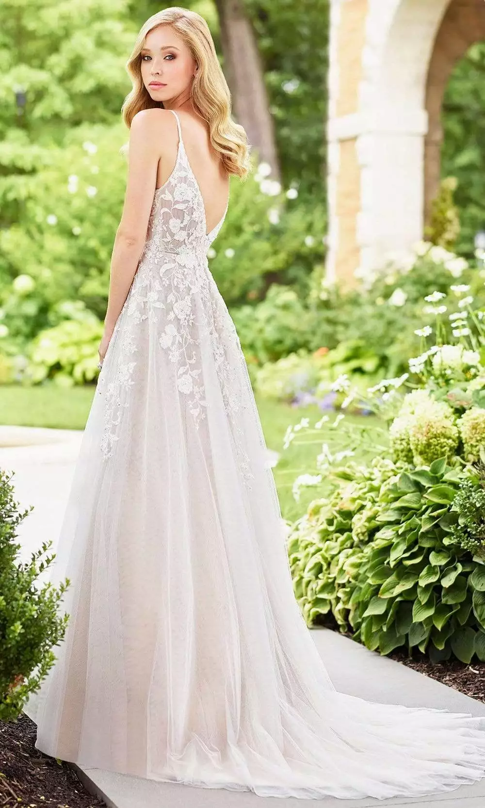 From head to toe, you look gorgeous in a detailed gown from Enchanting by Mon Cheri 118136. Radiant and oh-so-flattering, this sleeveless tulle A-line gown with sequin embroidered appliques and beading offers spaghetti straps, a curved V-neckline, a lace illusion midriff with a thin waistband, a lace dropped waistline, and a deep plunging V-back. Gorgeous embroidered appliques trail off down the tulle skirt and chapel train. Separate sweetheart bodice lining included. This Enchanting by Mon Cheri style is perfect for any traditional wedding or lavish affair.