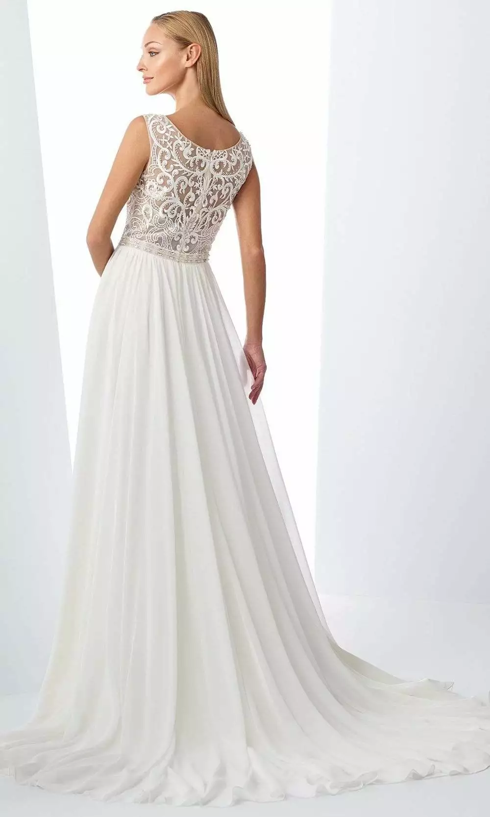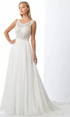 Step out in a gorgeous gown from Enchanting by Mon Cheri 119115. This swoon-worthy sleeveless chiffon A-line gown features a scoop neckline, intricately embroidered and sequin sheer tulle bodice with a matching back and zipper, a beaded natural waist and a gathered chiffon skirt with a court train. A separate bodice liner is included for the option of more modesty. Every bride dreams of this beautiful gown from Enchanting by Mon Cheri.
