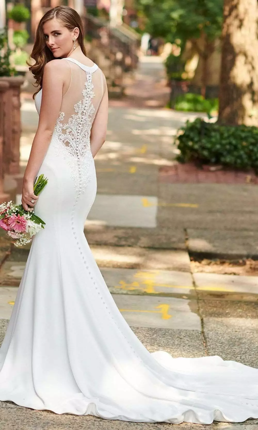 Wrap yourself in fascinating elegance on your wedding day in this Enchanting by Mon Cheri 120176 creation. Sculpted with princess seams on a crepe silhouette, this gown features a jewel neckline. The sheer back has an ornate back with trailing fabric buttons. The mermaid skirt flares to the floor with a chapel train. Leave a trail of admirers in this impeccable Mon Cheri masterpiece. Model is wearing the Ivory color.