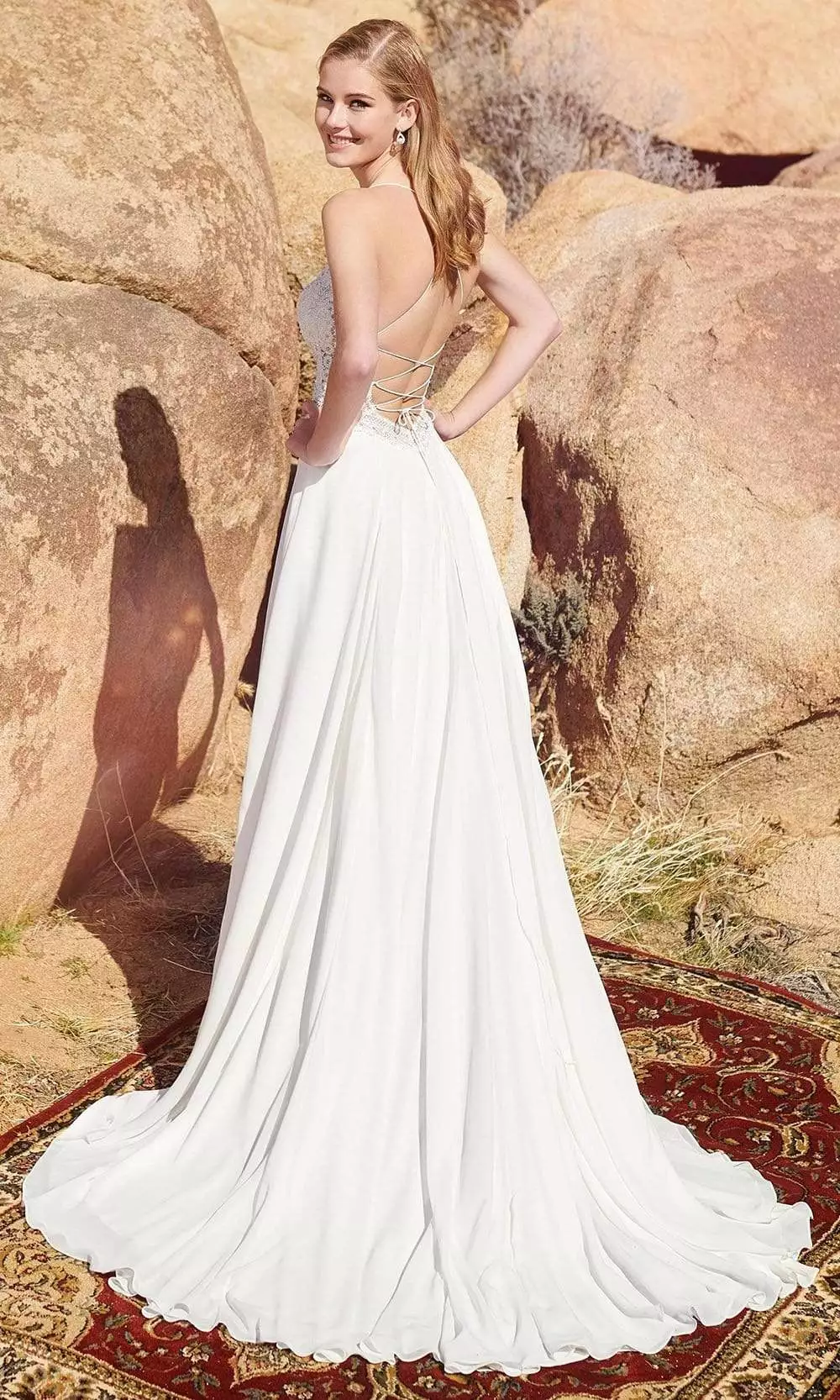 | Details: | Sheer lace bodice, Spaghetti straps, Strappy open Back, Hidden back zipper, Semi-chapel length train |