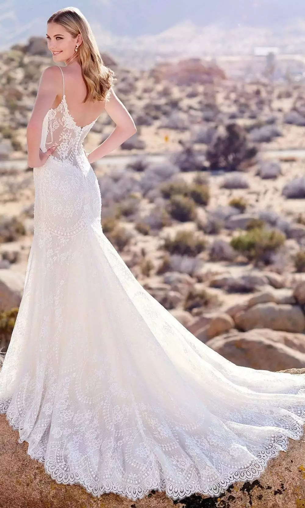 | Details: | Sleeveless, Plunging neckline, Mesh inset, Spaghetti Strap, Sheer back, Fit and Flare, Buttons down back, Hidden back zipper, Scallop hem, Court train |