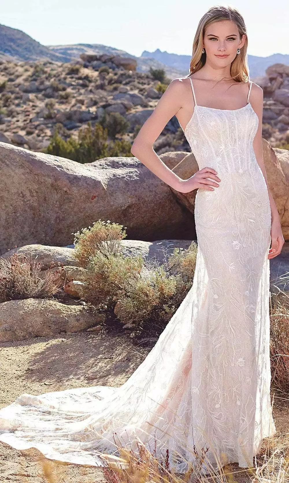 Be in this gorgeous Enchanting by Mon Cheri 220115 creation and leave a lasting impression. This beaded lace dress showcases a sleeveless, scoop neckline with beaded spaghetti straps. The fitted bodice is designed with a lace up back and a trumpet skirt with a train finish. Flatter your finest assets as you enthrall the crowd in this Enchanting by Mon Cheri look. Model is wearing Ivory/Nude color.