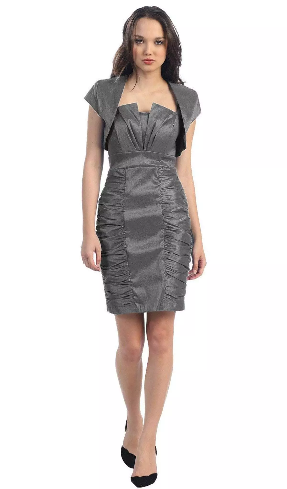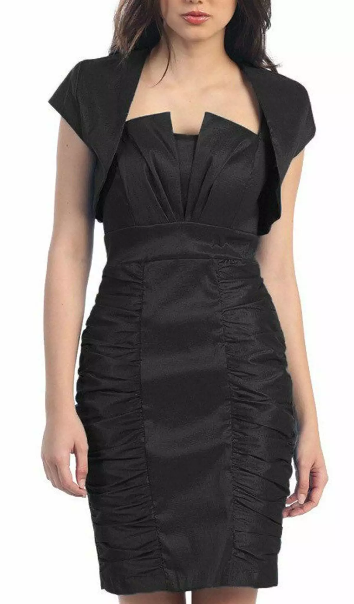 | Details: | Stretch Taffeta fabric, Two piece set, Sleeveless dress, Bolero jacket, Ruching, Soft cup inserts, Back zipper closure, Fully lined |