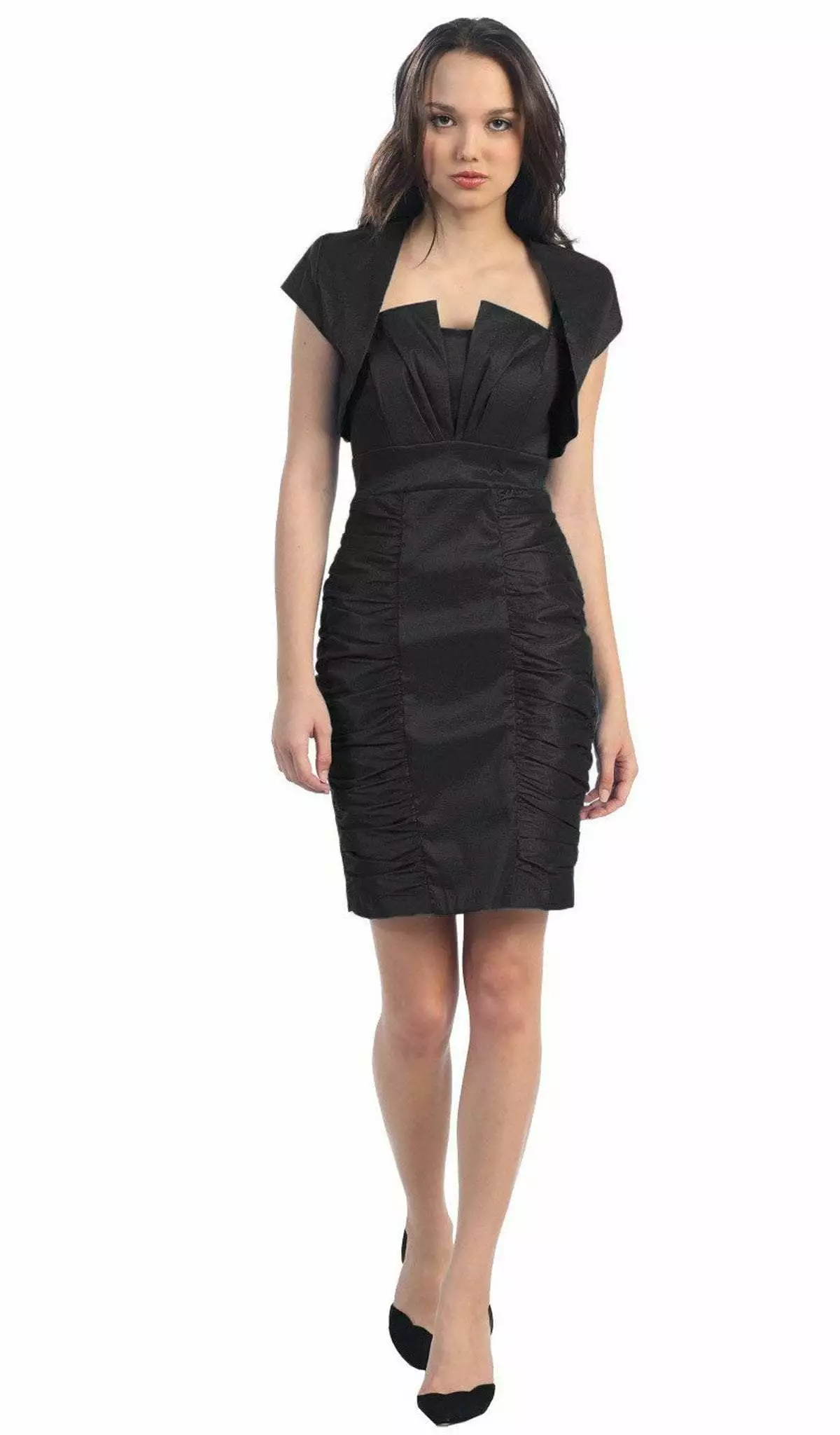 Get ready to be captured in picture of sophistication in this classy Eureka Fashions 1801 cocktail dress. The sleeveless bodice is fashioned in stretch Taffeta fabric features a straight across neckline with split outline bustier, spaghetti straps and banded cinched natural waist. The sheath skirt features soft ruching and follows the contour of the hips and finishes to a mid-thigh length. A matching cap sleeved Bolero jacket completes the look of this elegant creation by Eureka Fashions. Perfect for cocktail parties, weddings, and formal night outs.