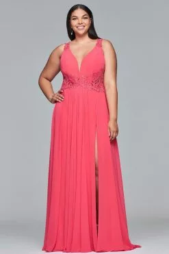 Show off your sweet side in this dress by Faviana 9433. This flowy chiffon dress features lace applique and a keyhole design at the back. This creation has a V-neckline that emphasized by the lace details and paired with an elegant A-line skirt that has a high slit design. This Faviana creation is truly remarkable! This model is wearing Guava color.