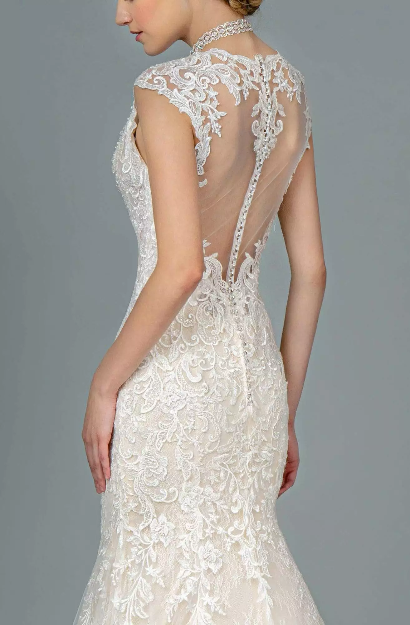 Get ready for everyone to stop and stare when you show up in this style by GLS by Gloria GL1802. This embroidered masterpiece dazzles in a deep V-neckline with cap sleeves and sheer inset at mid-bust. The fitted bodice is styled with buttons at the back and the skirt forms a trumpet silhouette with a train finish for added drama. This GLS by Gloria creation is truly remarkable!