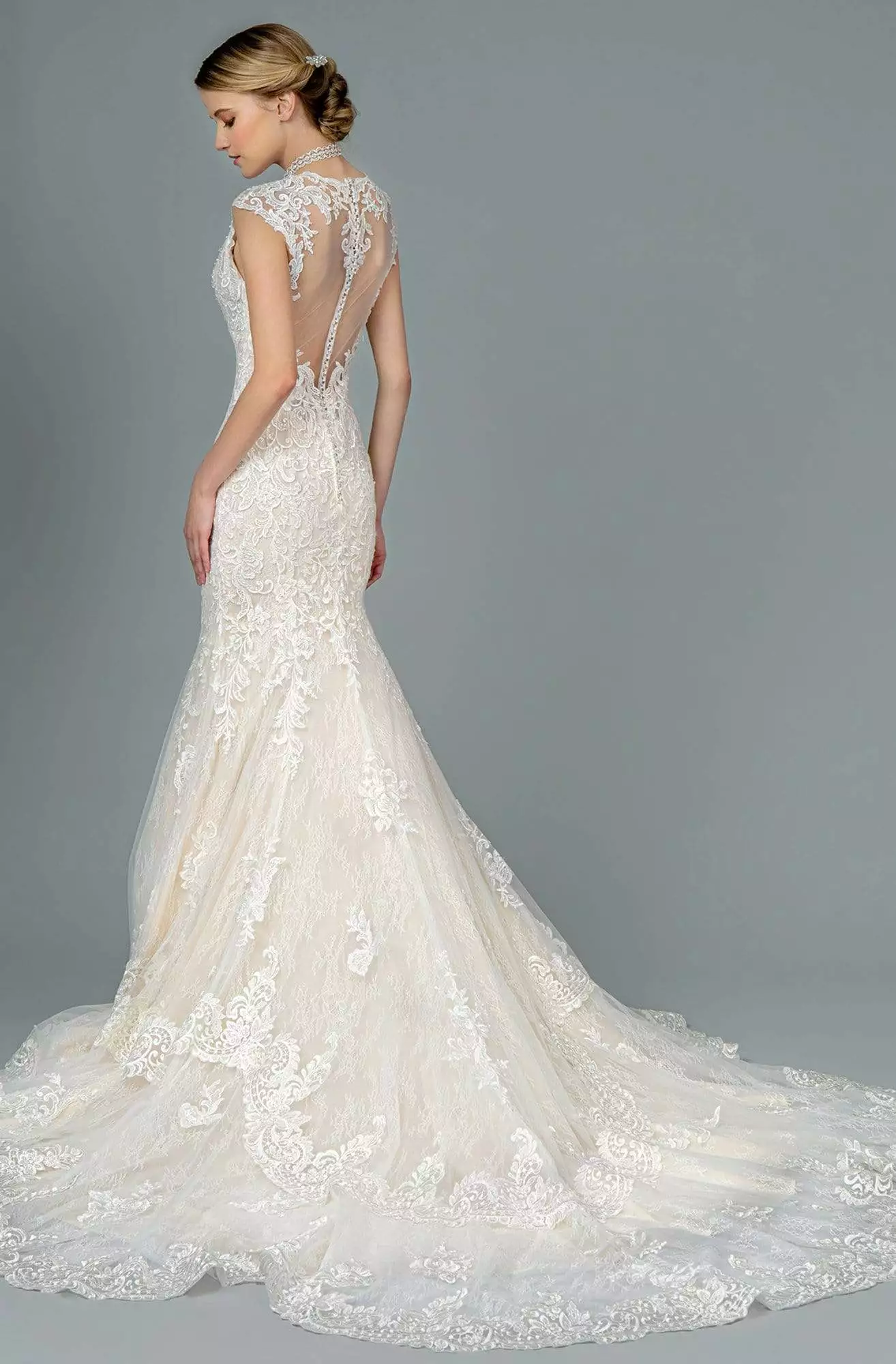 | Details: | Embroidery, Plunging neckline, Cap sleeves, Sheer inset, Trumpet skirt, Buttons, Train |