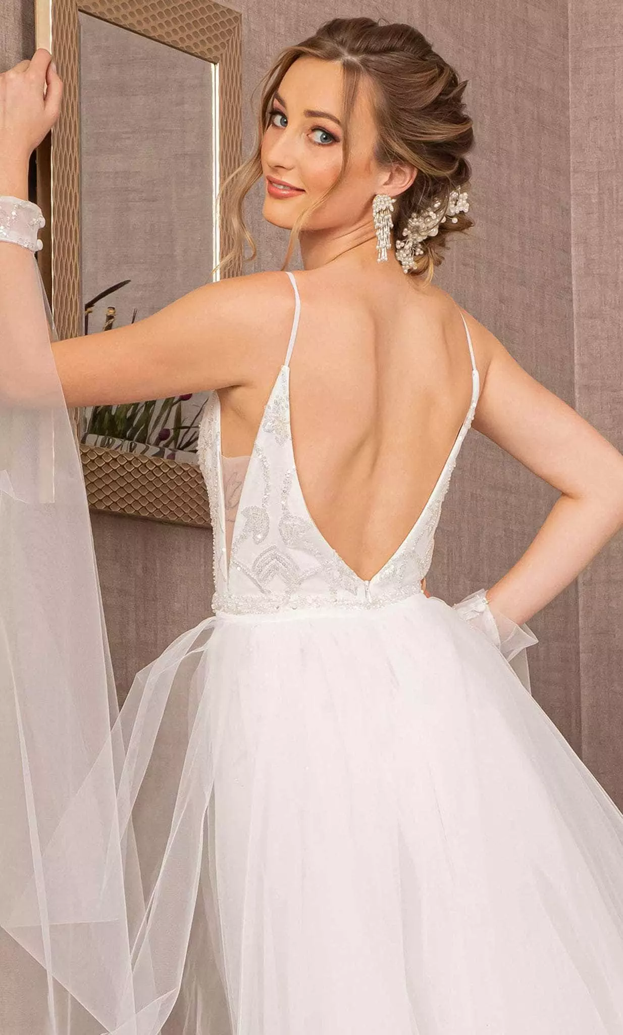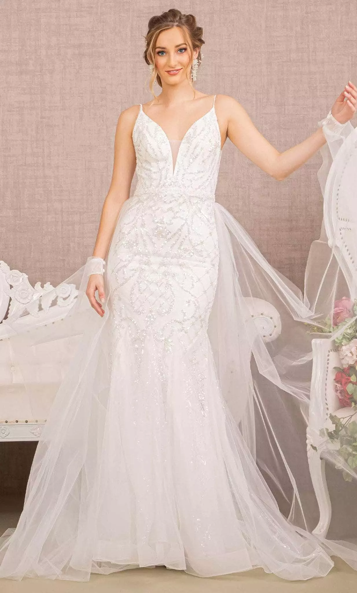Promote attention-grabbing style in this stunning Elizabeth K GL3157. This is a perfect bridal gown for outdoor affairs with its tulle overskirt and figure-contouring feature thanks to the trumpet silhouette. Has a deep neckline and a bodice embellished with appliques. Its arm sash that is directly connected to the overskirt adds more drama on your special day. Show off your gentler side with this lovely gown by Elizabeth K GL3157. Model is wearing Ivory color.