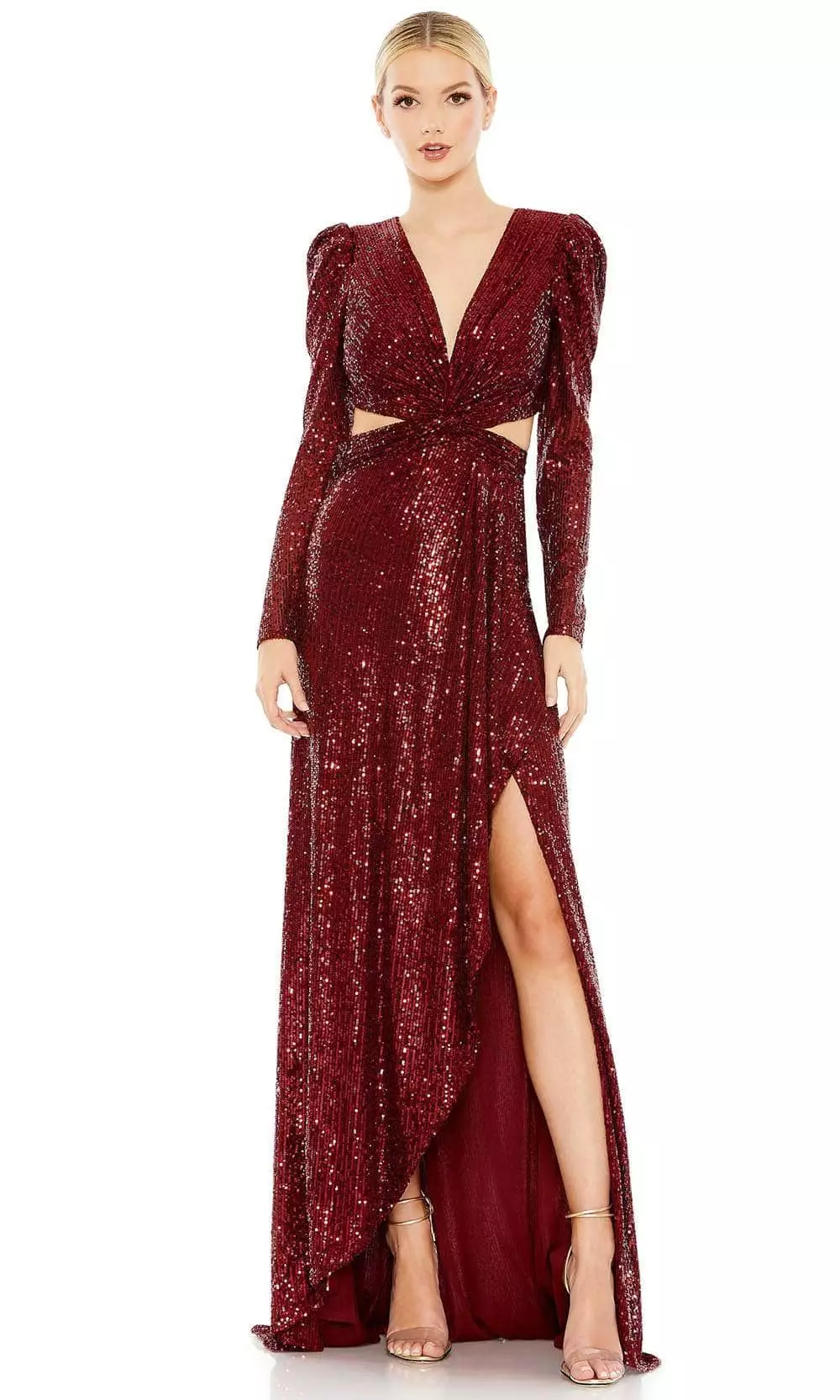Set a style that would engage everyone in this enchanting evening gown by Ieena for Mac Duggal 26739 masterpiece. Leaving you radiant all evening with this dress’ shower of sequins all throughout. Featuring a knotted bodice forming a V-neckline, side cutouts, and faux wrap skirt. The combination of the fitted high-low skirt and the long sleeves with a little of puff at the shoulders will make you look taller, while the open-back with crisscrossed straps adds fun to the whole ensemble. Bask under the fascinating luminosity of the spotlight when you slip on this elegant Ieena for Mac Duggal creation. Models are wearing Nude, and Wine colors.