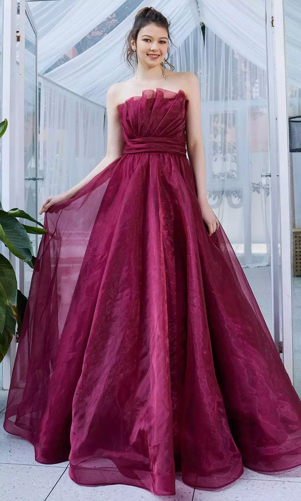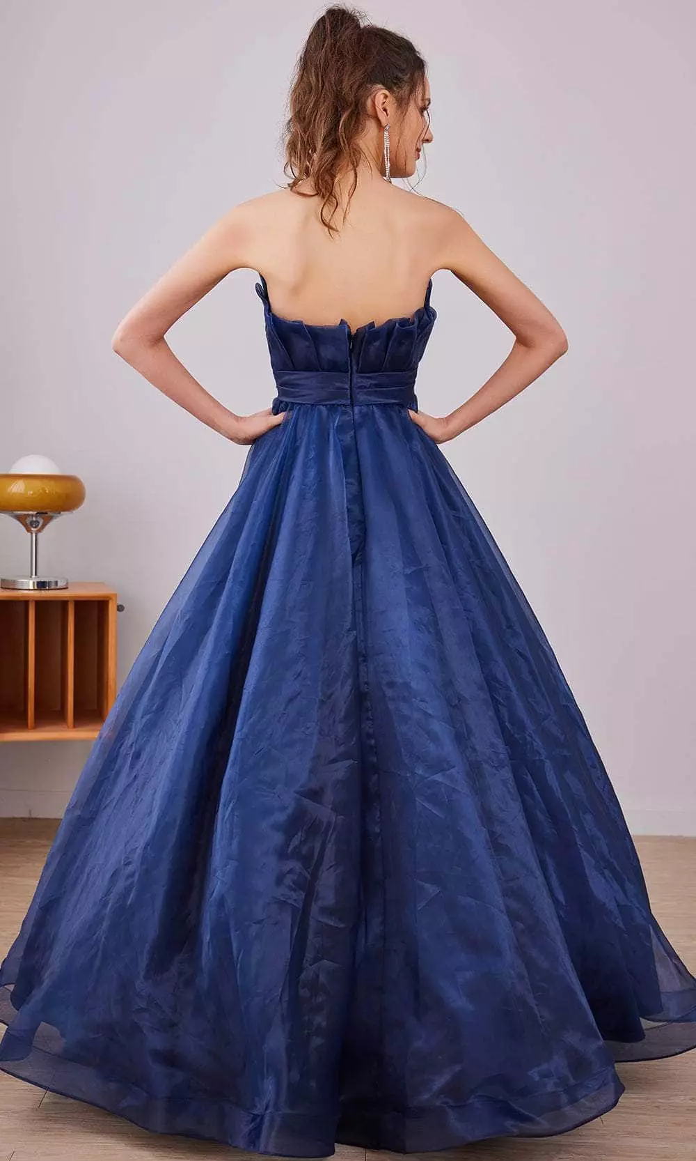 Sparkle all night long on the red carpet and at the spectacular event in this prominent gown by Jadore J21035. Beautifully tailored in organza fabric, this charming ensemble features a strapless, straight across neckline and a mid-open back with a center zipper closure. The gown highlights a wide pleated waistband and it gives way to the pleated A-line skirt that flows in a full-length hem. A gorgeous sweeping train adds a perfect finishing touch to this gown. Make your perfect day blossom with a promise of forever in this Jadore masterpiece. Models are wearing Blue, Navy, and Wine colors.