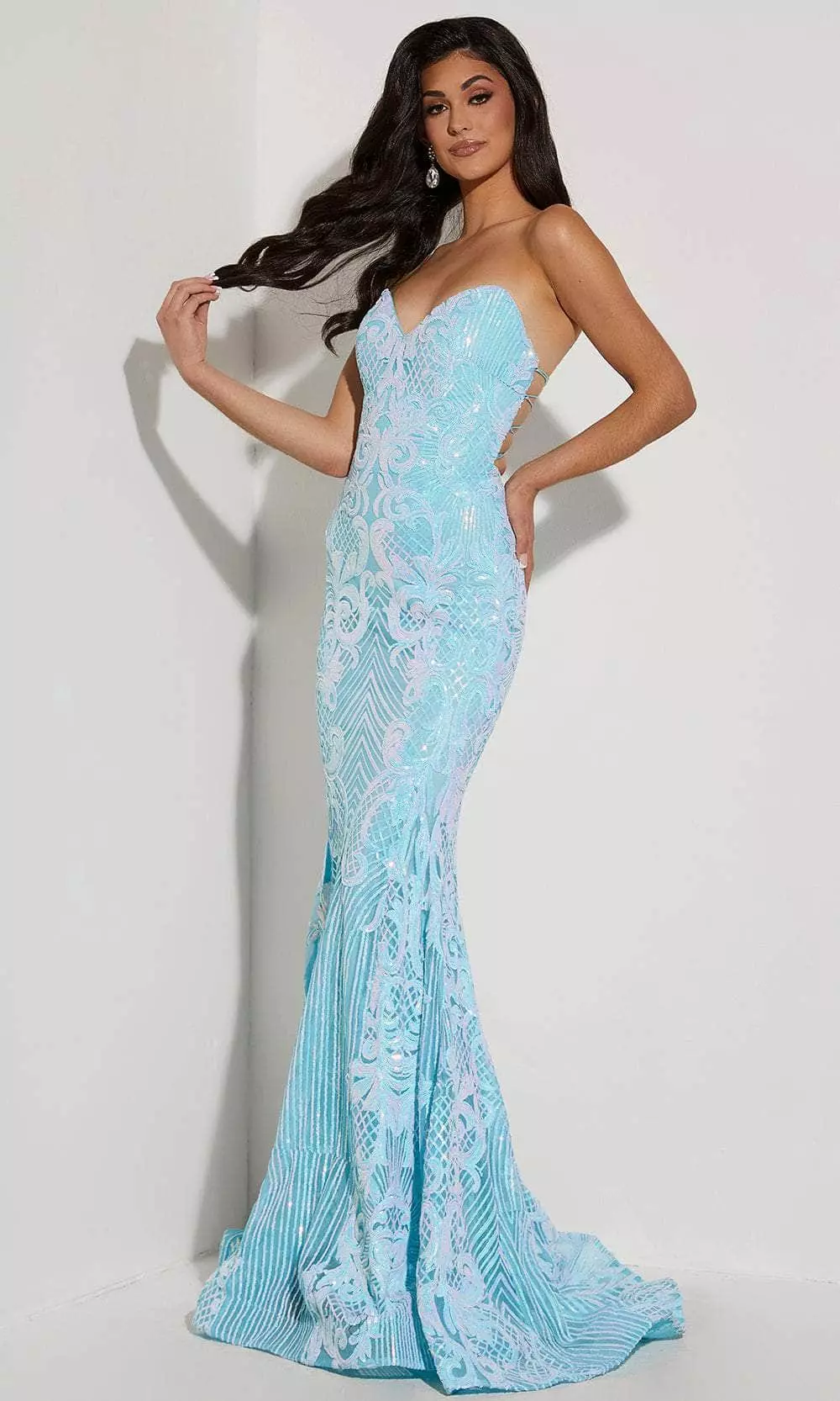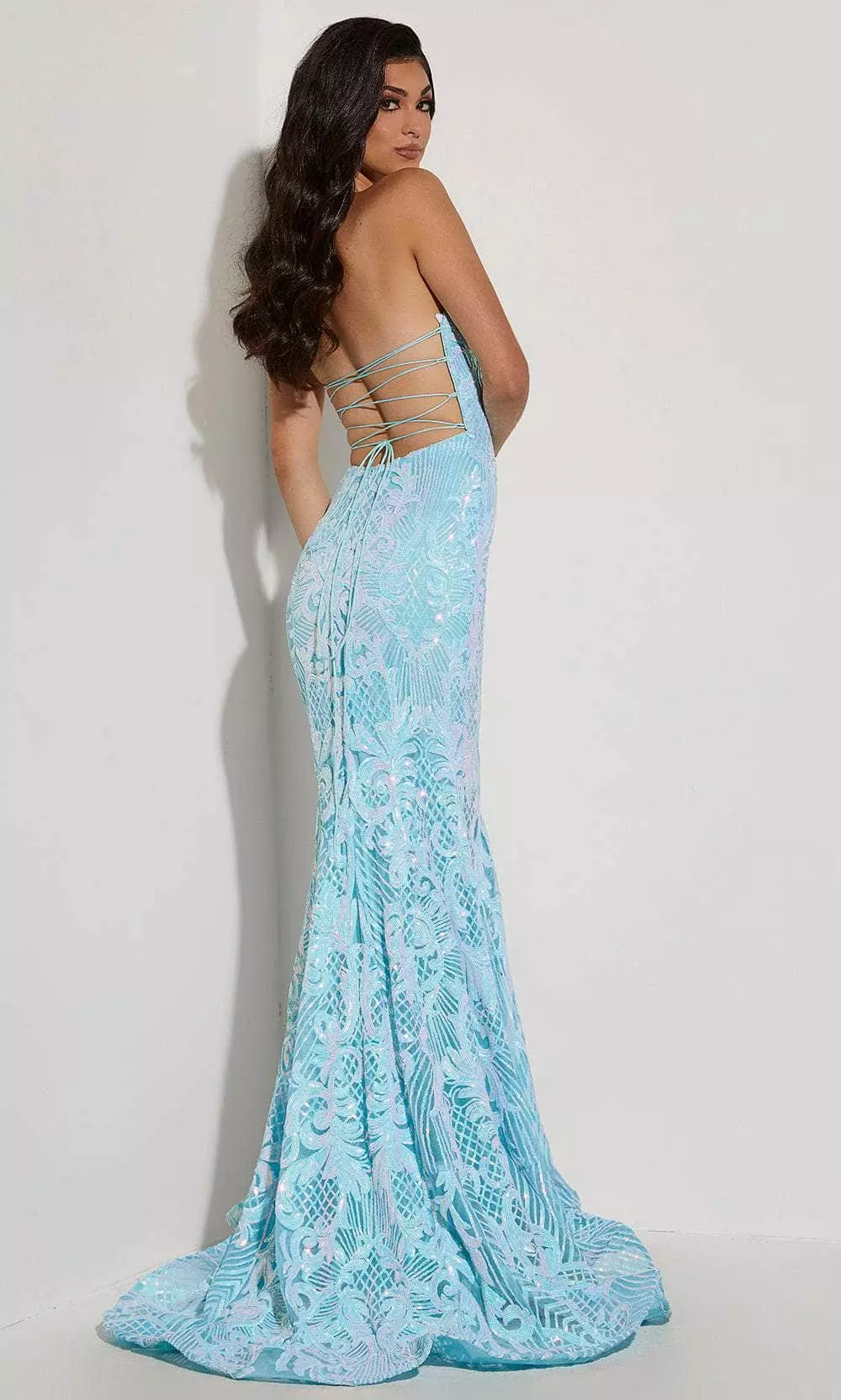 This Jasz Couture 7430 eccentric design will elongate your figure. The fitted bodice of this glamorous sequin embellished dress charms with a plunging sweetheart neckline. Clean seams are crafted to emphasize your curves and add a gorgeous touch. The open back has a lace-up tie for an adjustable fit. The full-length skirt parades in a mermaid silhouette and ends with a trailing train. Unleash that sophisticated siren in this Jasz Couture 7430 masterpiece. Models are wearing Hot Pink, Aqua, Yellow and Lilac colors.