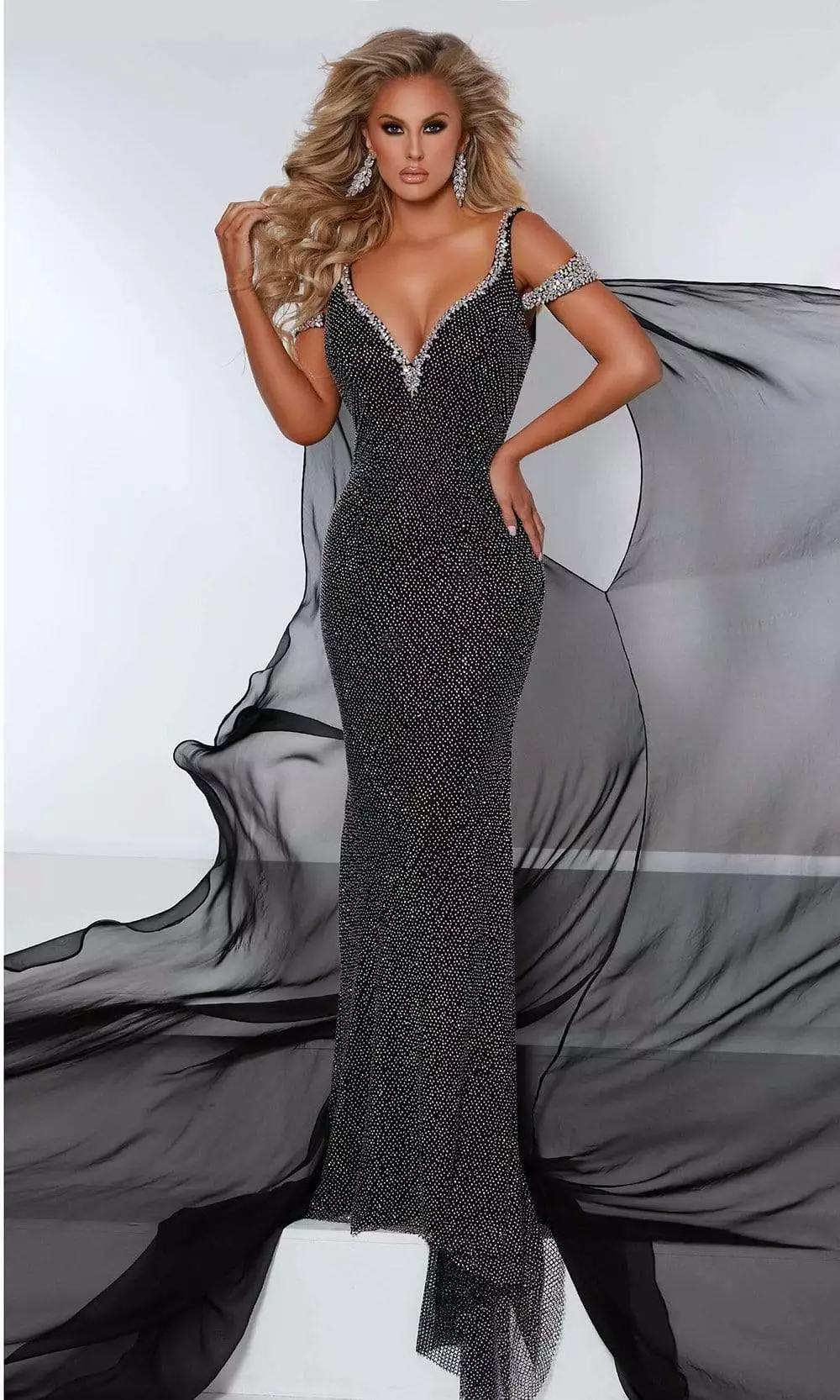 Walk in a defined sophistication and beauty wearing Jonathan Kayne 2440. This sleeveless ensembles parades of a pallete crystal sequin embellished all over the gown. . The off shoulder sleeves that makes it more adorable. The top chiffon cape adds a factor to shine. The back cut out design is perfect to show a little skin, supported with a back zipper closure. Flatter your finest assets as you enthrall the crowd in this Jonathan Kayne .