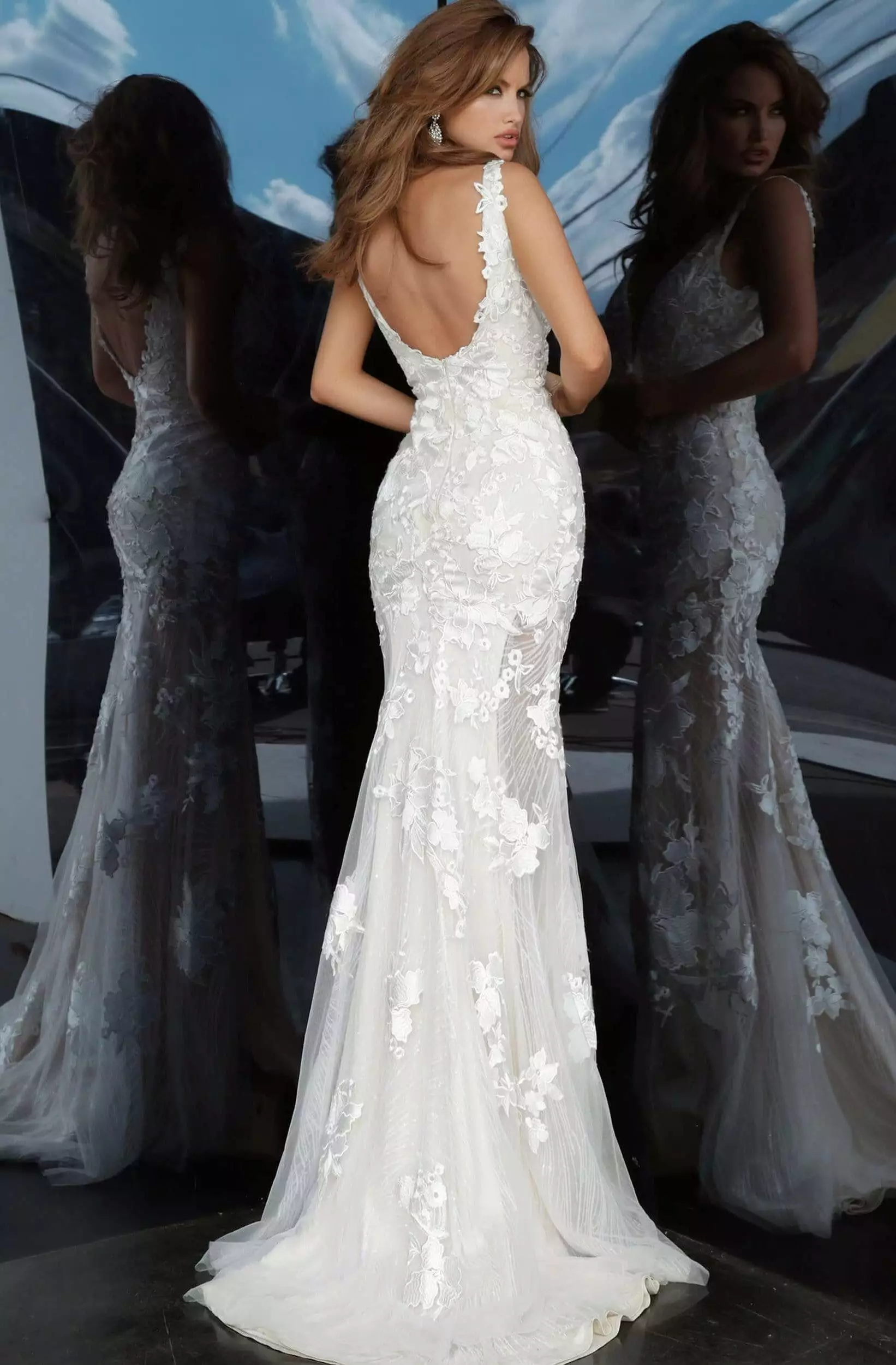 Get noticed in any crowd wearing this design by Jovani 02444. This floral embroidered lace dress boasts a sleeveless, deep V-neckline with a fitted bodice tailored with a low scoop back. The skirt forms a fit and flare silhouette with a sweep train finish. This Jovani creation is truly remarkable! Model is wearing White/Nude color.