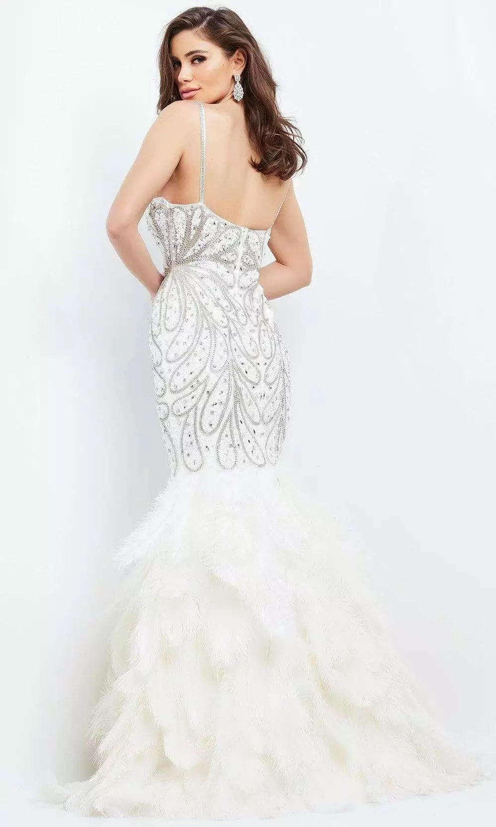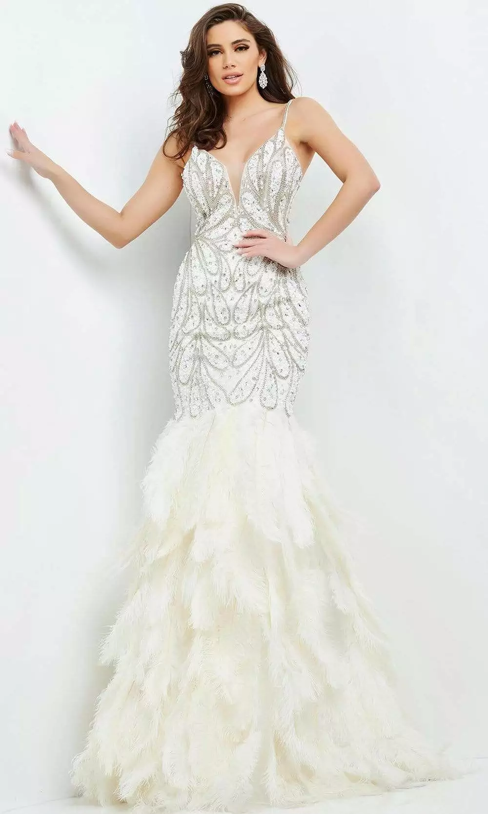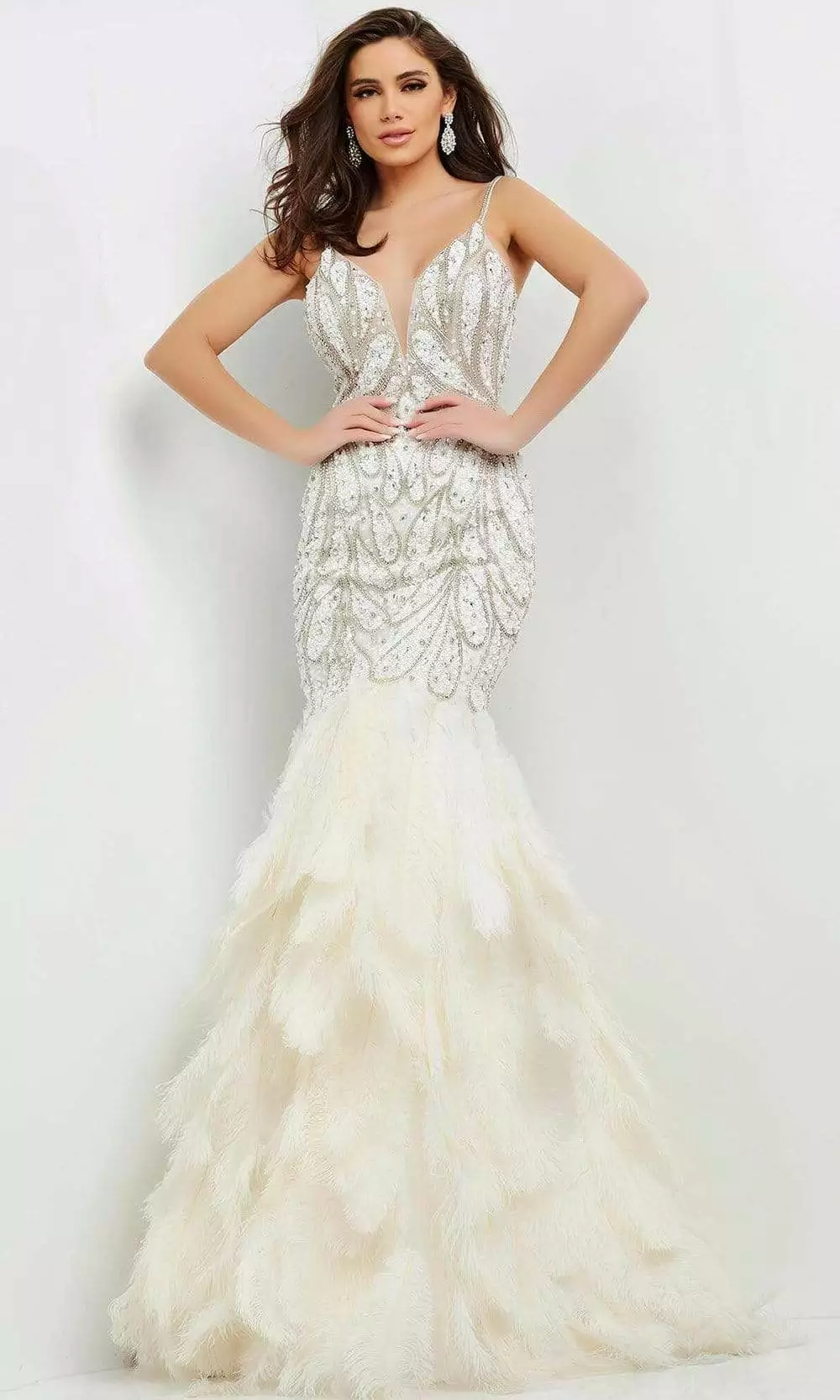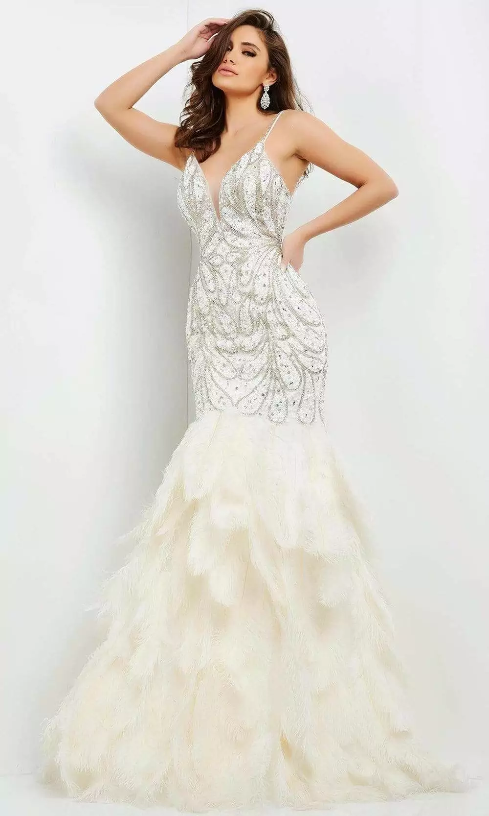 Strut those refined asserts in this timelessly chic Jovani 04625 creation. Rendered in a rich and vibrant embellished silhouette, this gown flaunts a fitted bodice with plunging v-neckline and an illusion inset. Beaded spaghetti straps trail down to an open back. Tiers of feathers create the flare and train of this sumptuous trumpet silhouette. Look absolutely breathtaking in this Jovani masterpiece.