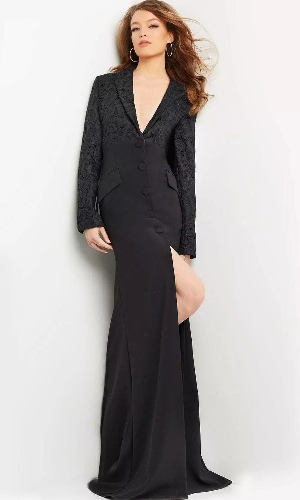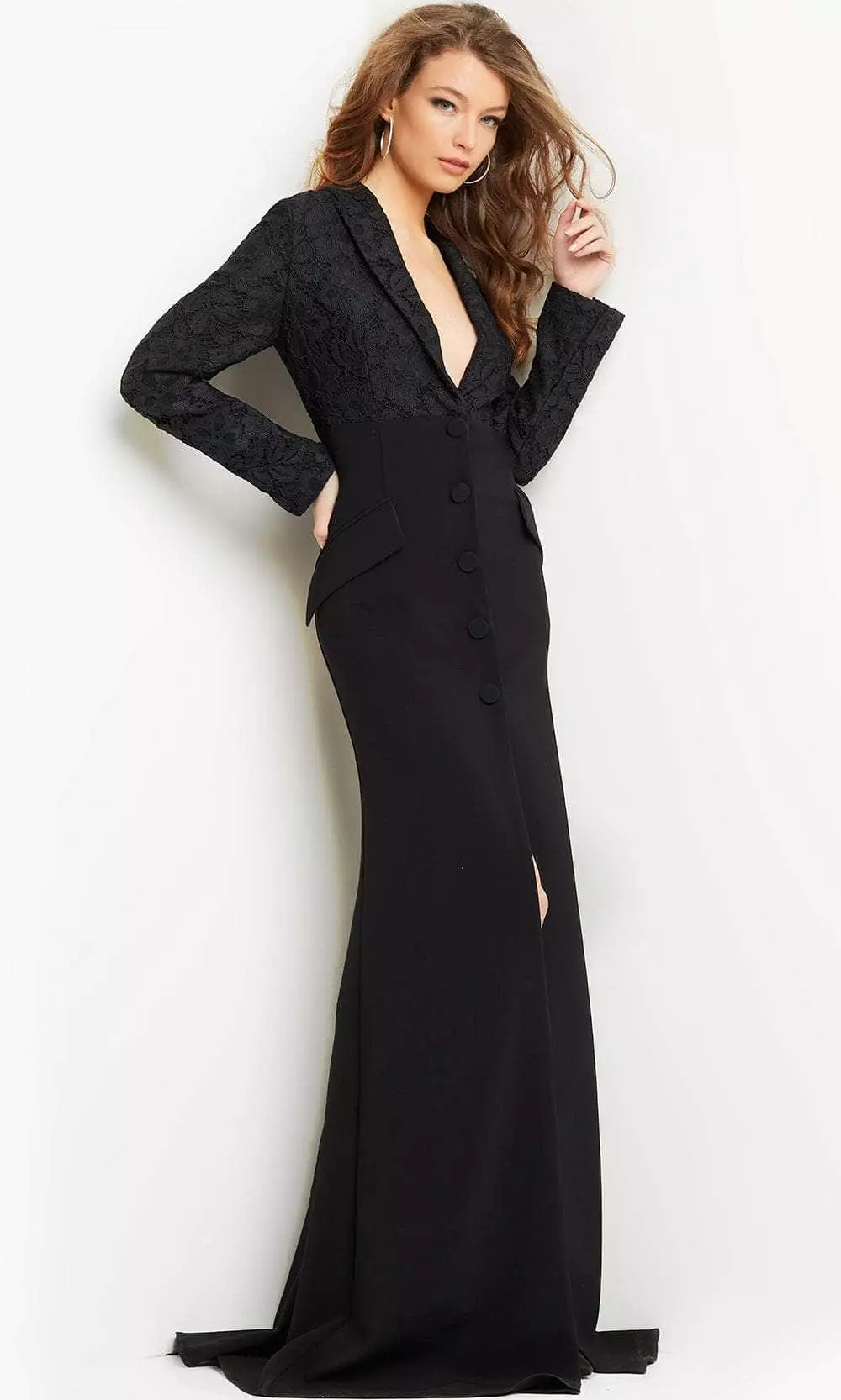 Make an extraordinary statement when you walk in this classy Jovani 07552 masterpiece. This tuxedo styled gown showcases a lace top framed with long sleeves and a plunging V neckline with lapel detail. Tailored with seams, the full length trumpet skirt is accented with front pockets flaps and buttons. A sexy front slit and sweeping train complete this look. The perfect details of this Jovani gown make it the best choice at your prom, military ball or at any formal evening event. Jovani offers sophisticated, sexy, fun, and glamorous dresses. From unique beading and detailed designs to sexy strapless gowns, classy lace dresses, and elegant halter necklines — Couture Candy have it all. Model is wearing the Black color.
