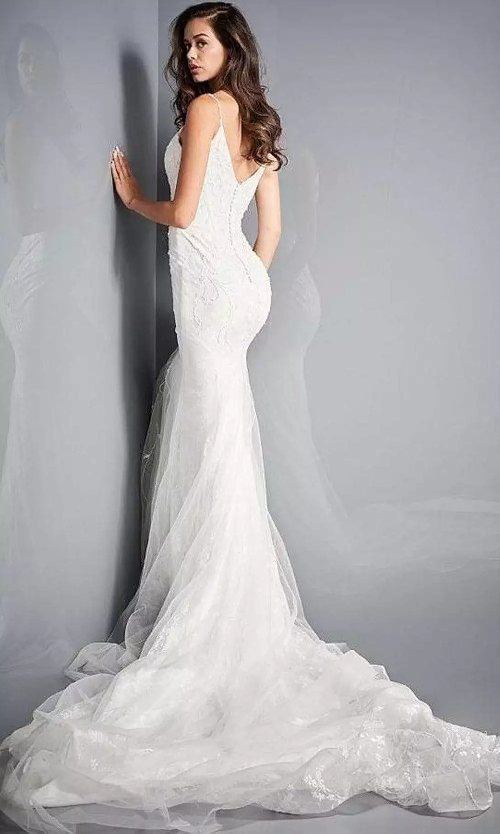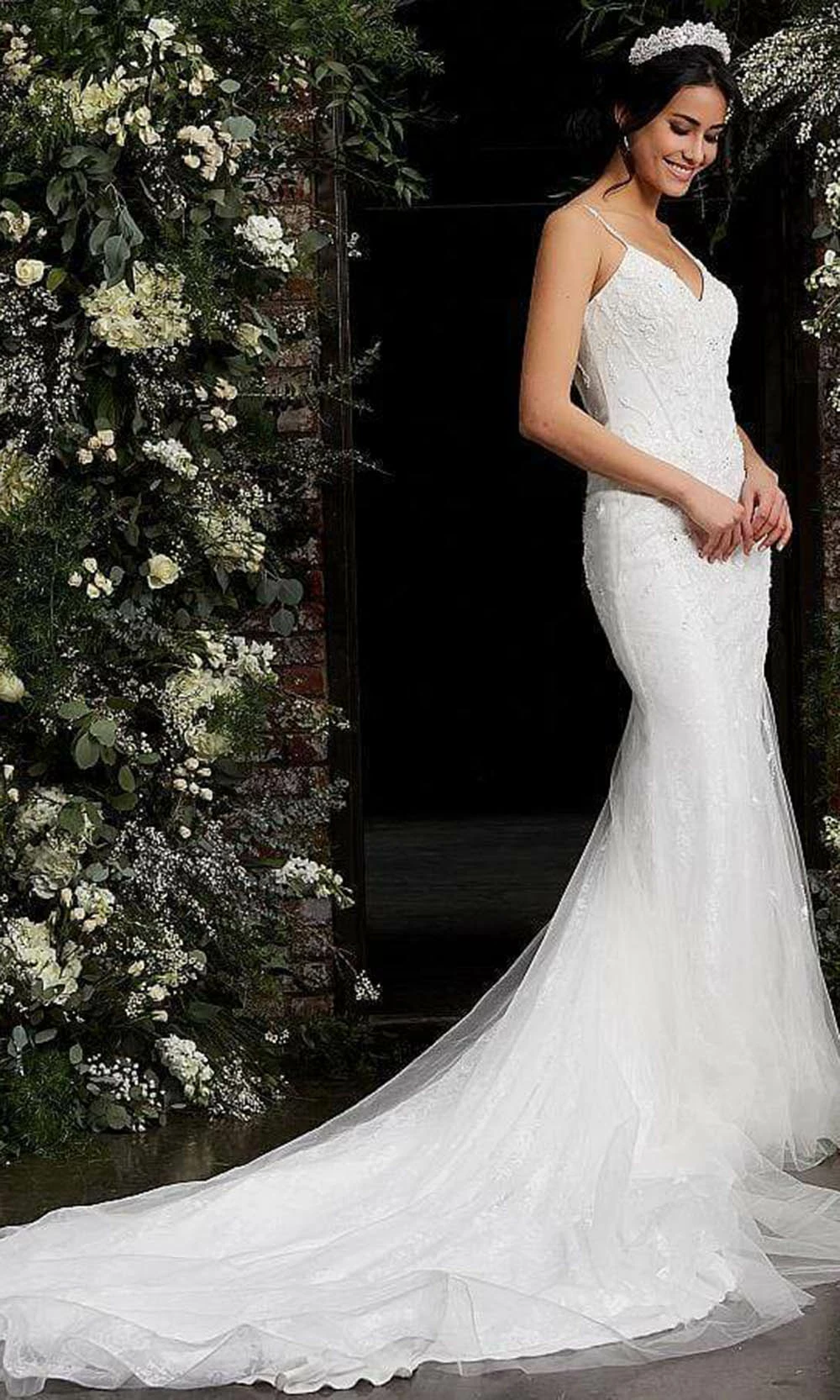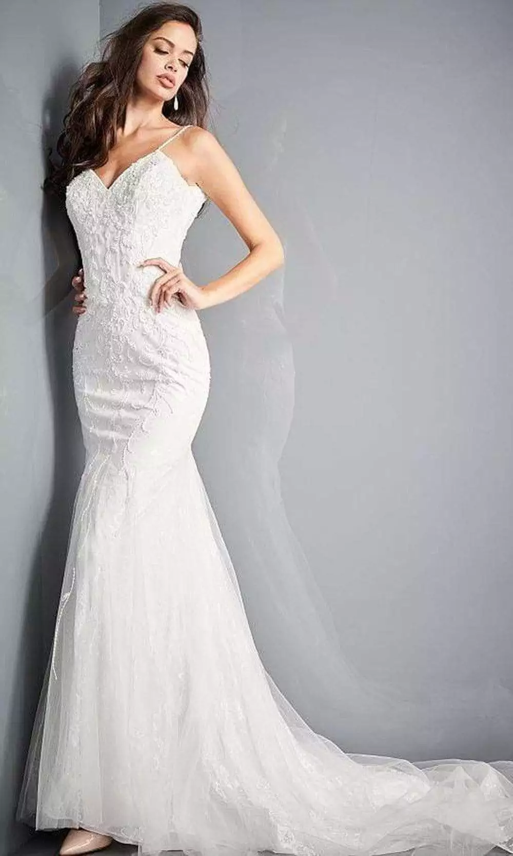Step through the chapel door in the flowing, icy perfection of a romantically beaded wedding gown from Jovani JB03909. This long and beautiful wedding dress in sheath silhouette is embellished with beads on the fitted bodice. It provides a long train and presents in V neckline ands spaghetti straps. It is closed by back buttons. Have confidence that your grand entrance will be everything it deserves to be when you wear this Jovani wedding dress.