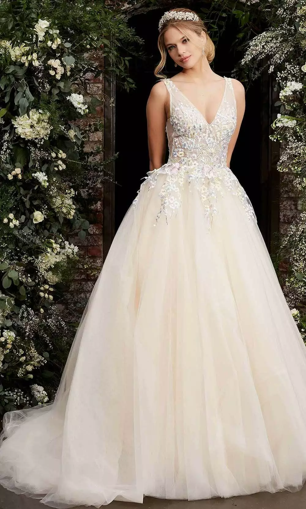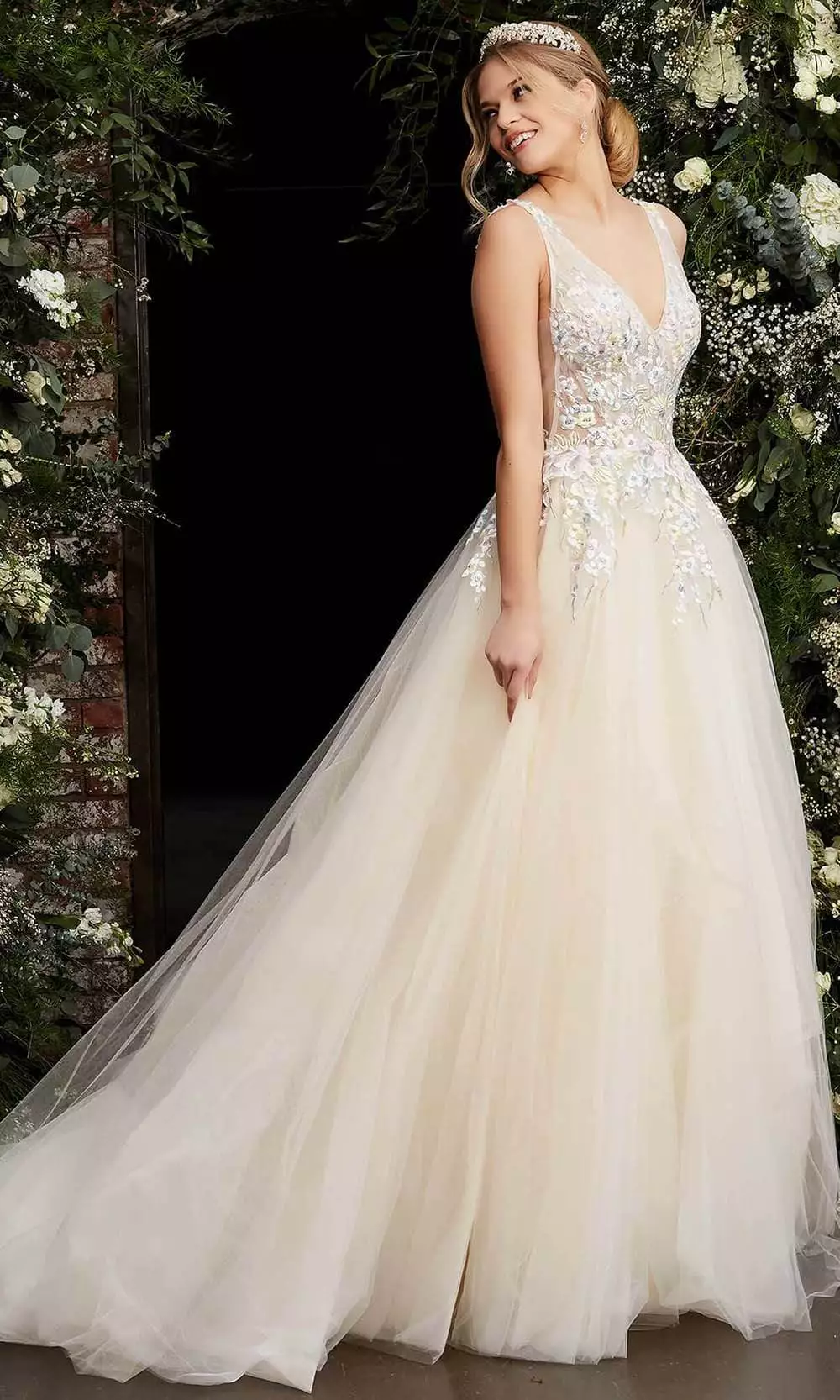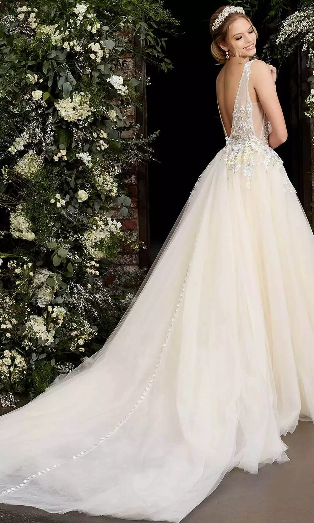 Charm everyone with the timeless beauty of this Jovani JB07200 bridal creation. Embroidered with pastel blossoms and rhinestones, this gown charms with a v-neckline and coupled with a sheer v-open back. Voluminously layered with tulle, the skirt cascades into a frothy trailing train. Radiate sweet opulence in this magnificent Jovani bridal masterpiece.
