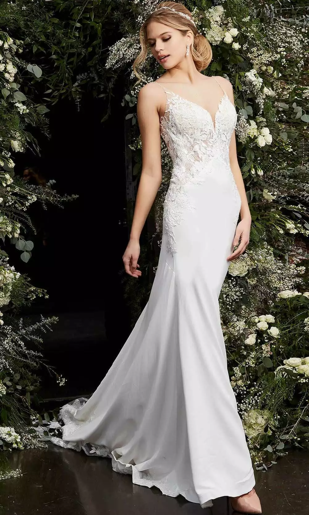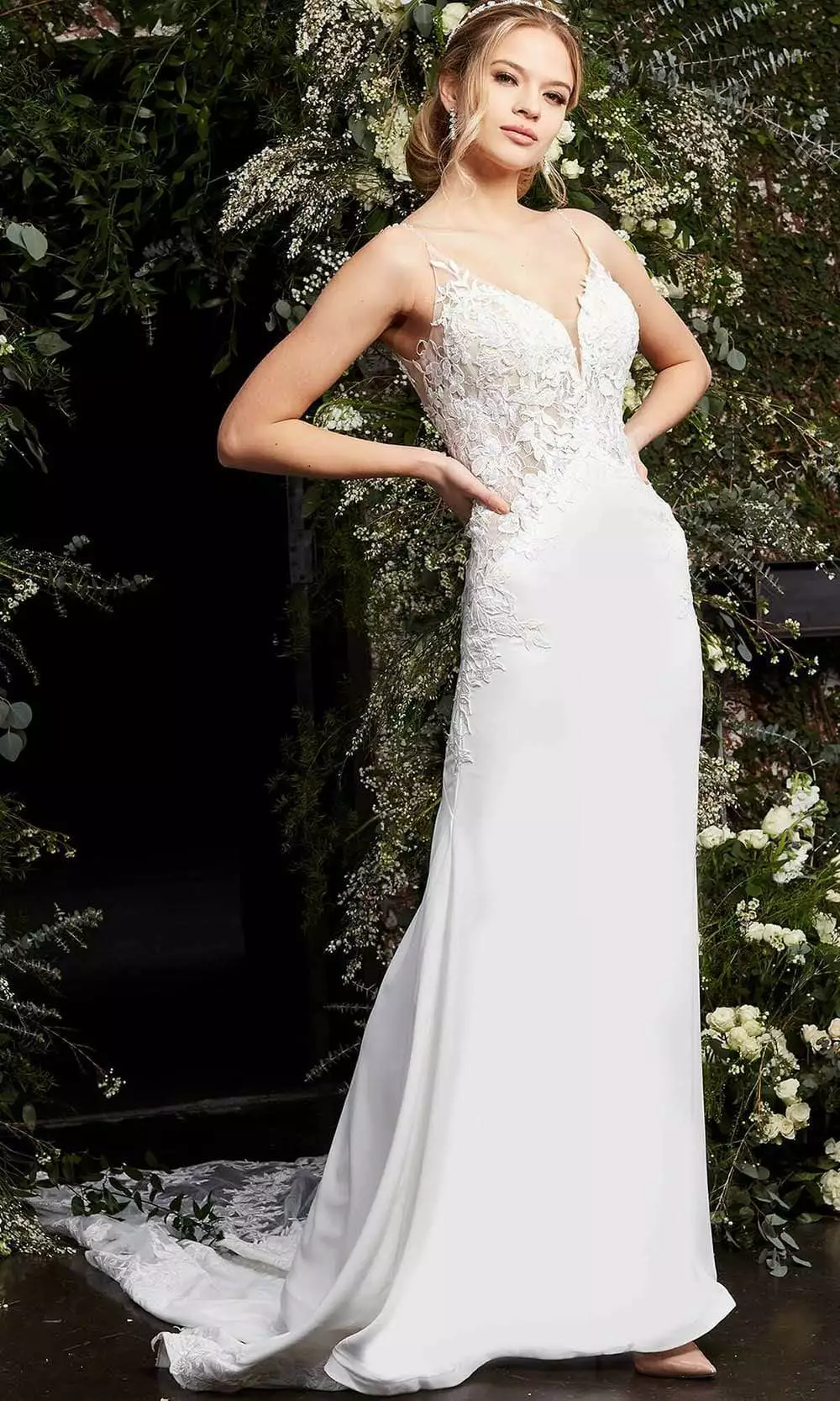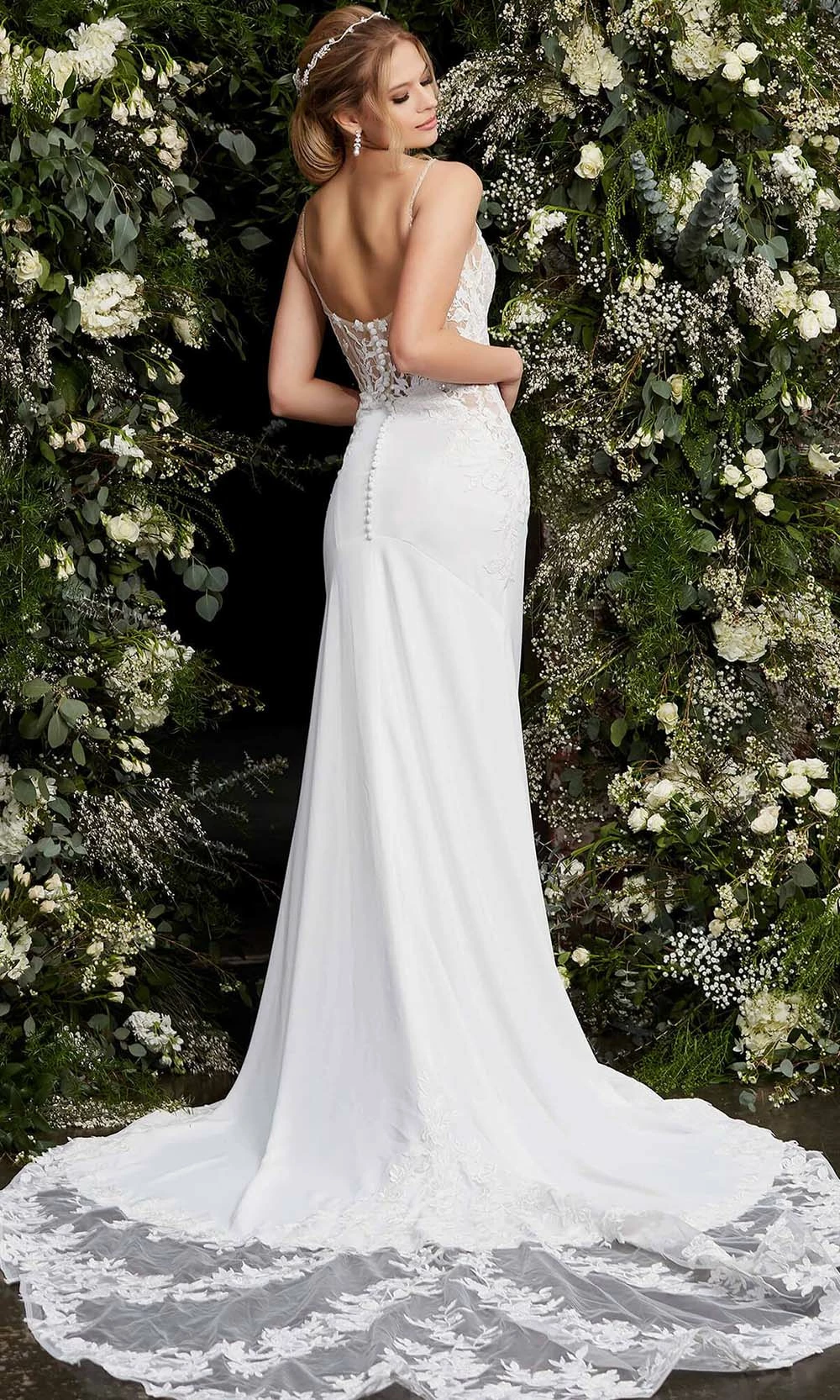 Walk down the aisle with immaculate beauty in this Jovani JB07201 creation. Fascinatingly sculpted and accented with floral lace details, this gown features a v-neckline with spaghetti straps. Styled with a sheer back and trailing with buttons, this stunner reveals a sheath silhouette with a gossamer train. Lavish in the sweet romance of this Jovani bridal masterpiece.