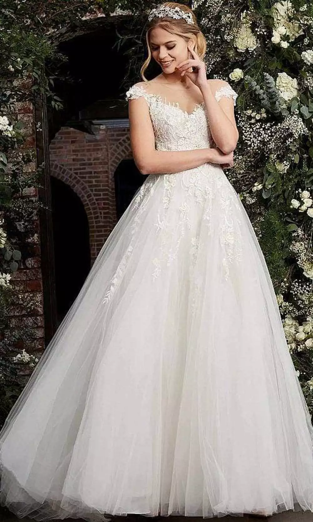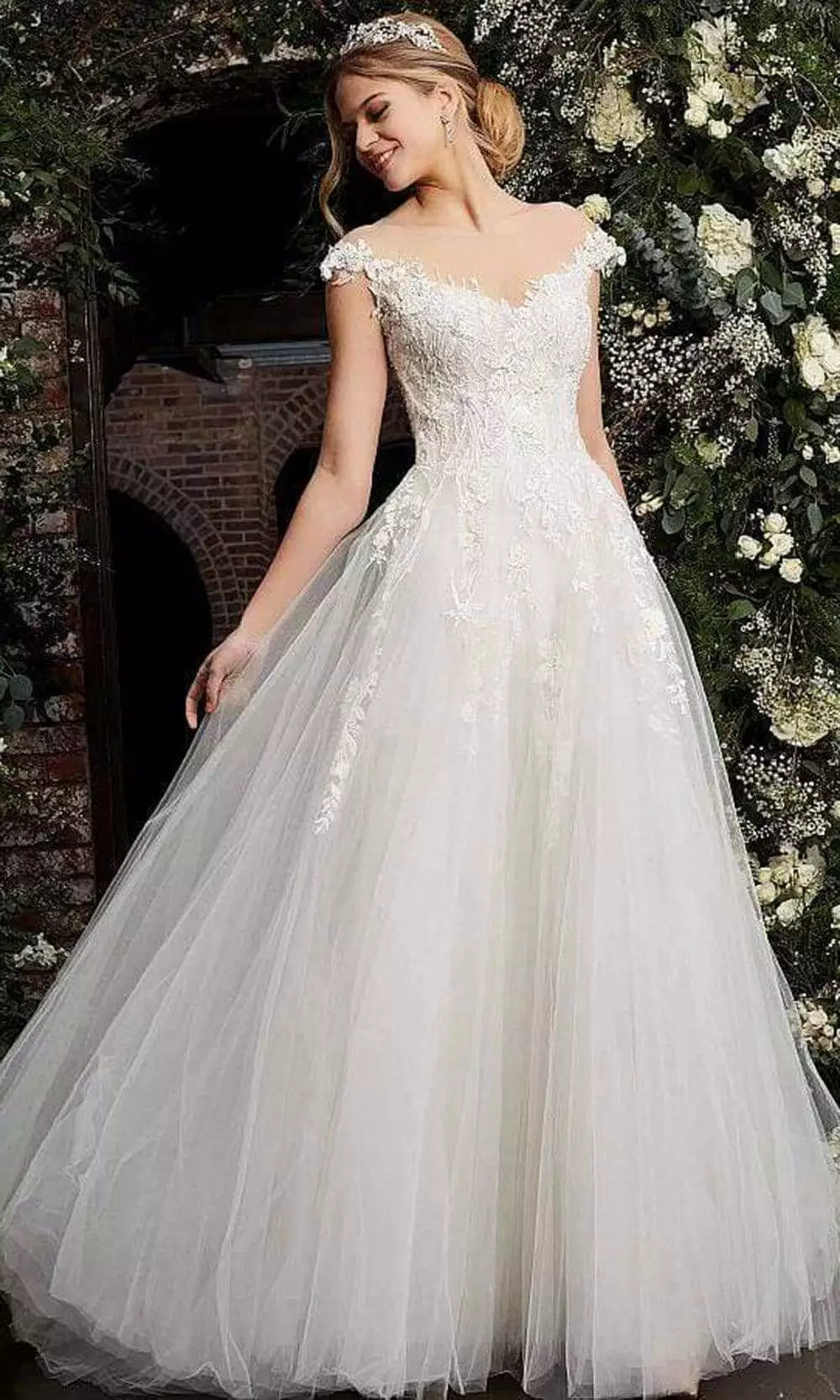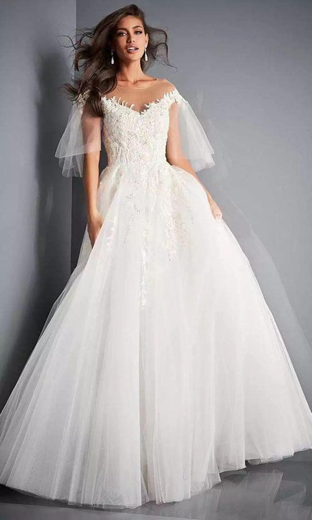 Jovani JB67209 wedding dress offers vintage-inspired glamour for the modern bride-to-be. This bridal gown is made with tulle fabric and parades a voluminous A-line silhouette. It shows off an illusion effect with the neckline whilst the bodice is appliqued with beads and flowers. It has detachable sheer sleeve for a different style. This Jovani design is as well-suited for a lavish indoor wedding as it is for a more relaxed outdoor affair.