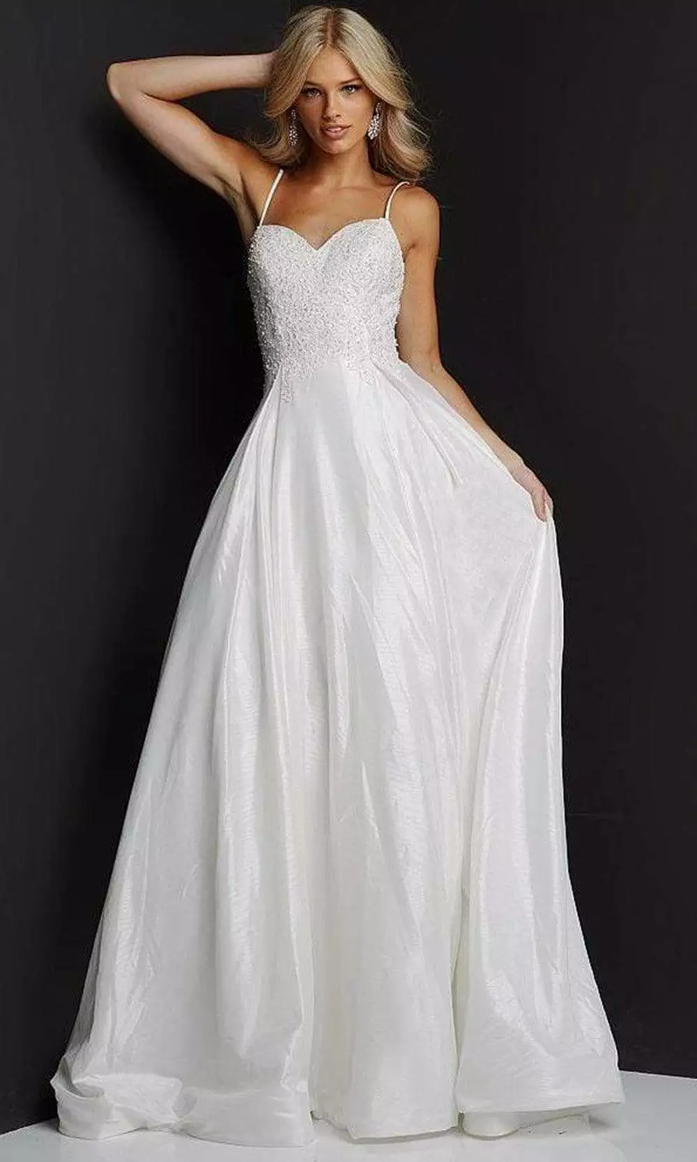 Mesmerize everyone in this charming ensemble in JVN by Jovani JVN06796. Embracing a classic style, this spaghetti-strap gown features a sweetheart neckline adorned with stunning embroidery. The A-line skirt speaks for itself with no embellishments and lush fabric, save for two pleats that cinch the waist. It’s a classic look that works for many special occasions.