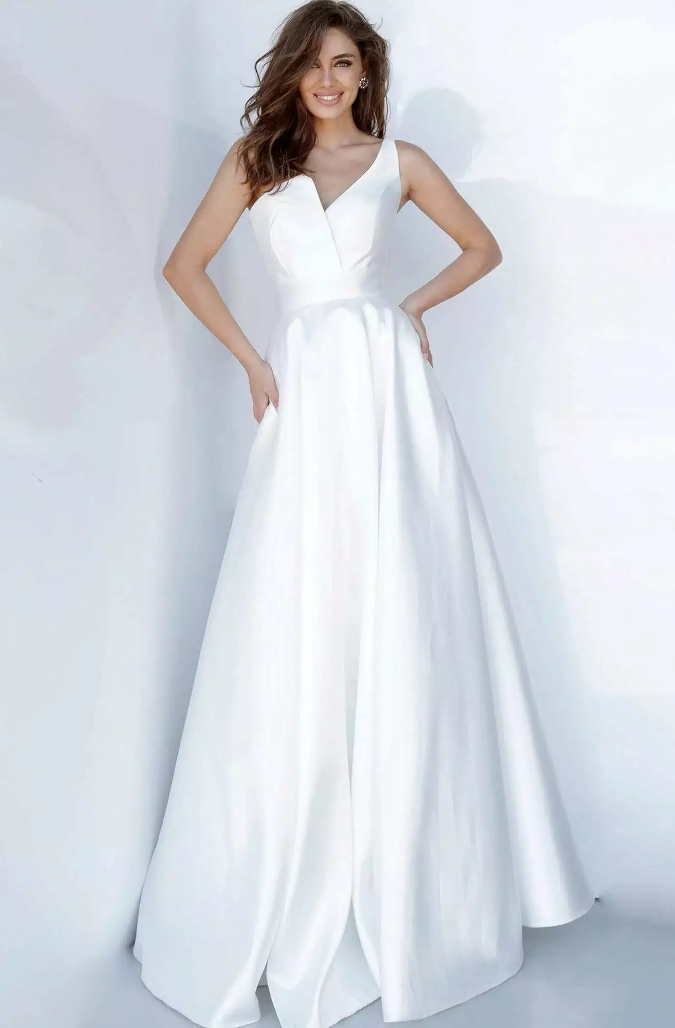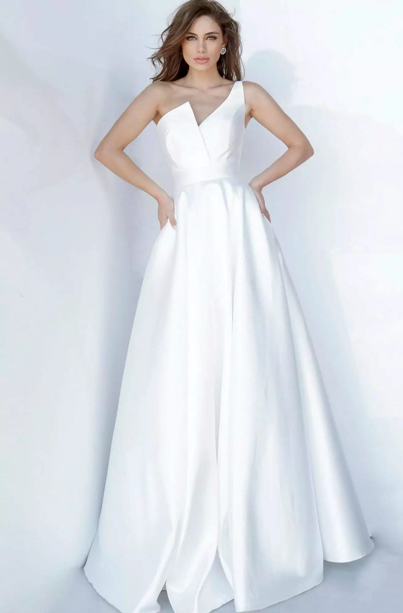 Let this dress by JVN by Jovani JVN3930 take you to any party in style. This mikado gown features a sleeveless, asymmetric neckline with a fitted bodice and a zipper closure. The skirt is tailored in a full-length A-line silhouette. Waltz into the party looking fabulous in this JVN by Jovani dress.