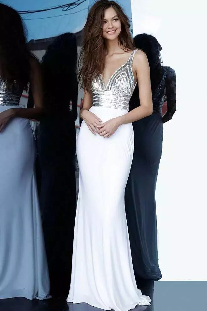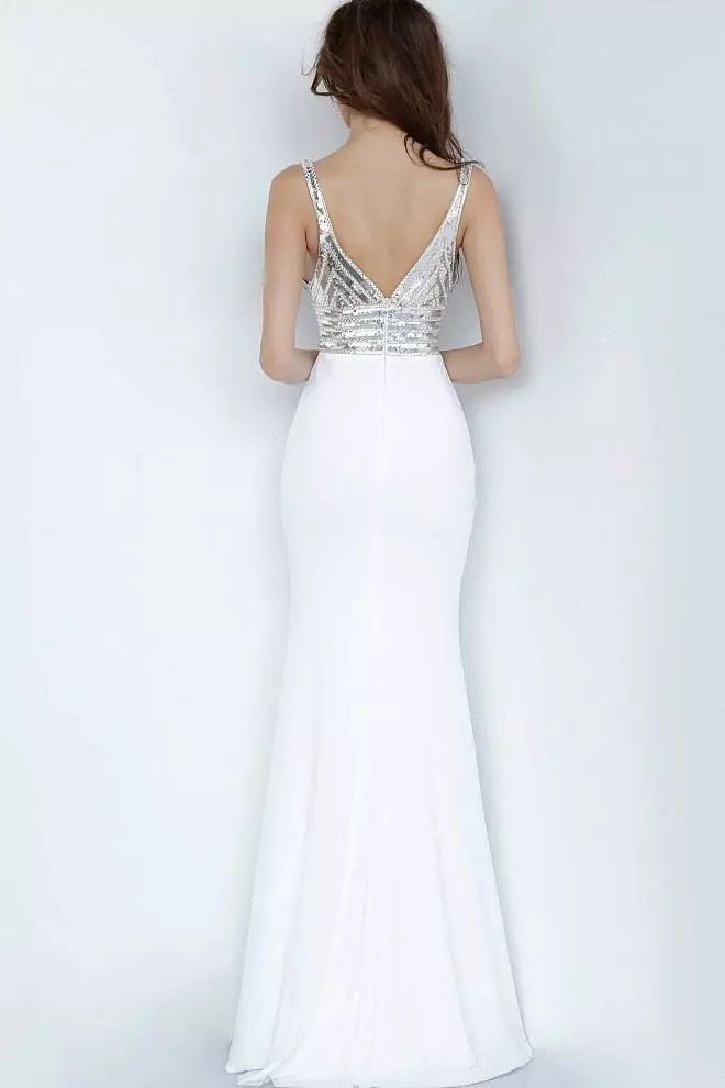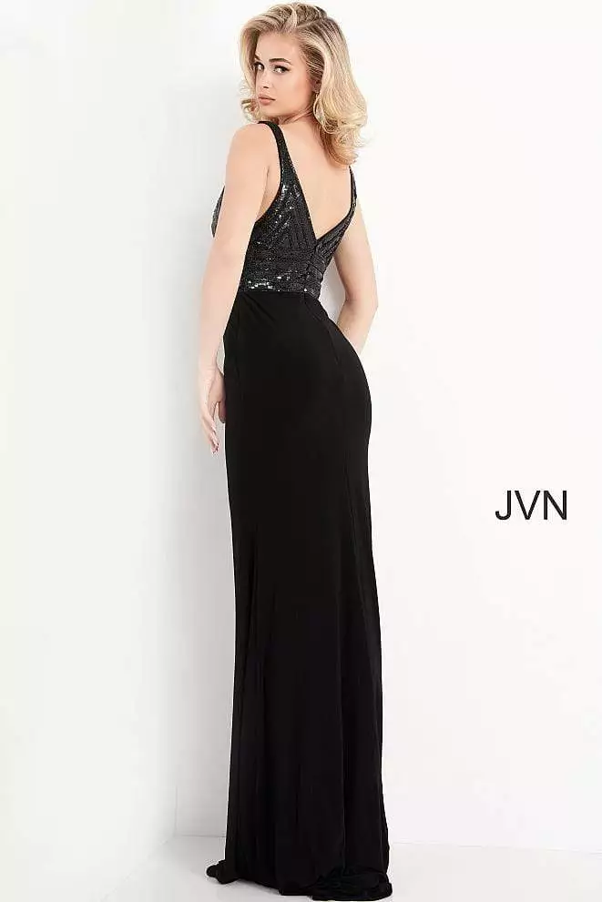 Every lade dreams of this beautiful gown from JVN by Jovani JVN4240. The fitted bodice is styled in geometric sequin embellishments with a plunging V neckline with a sheer inset detail at the bust, complemented with a low V back. Made in form-fitting chiffon, the skirt parades a sheath silhouette that ends in a slight brush train. This JVN by Jovani gown is designed to fit and flatter women.Â