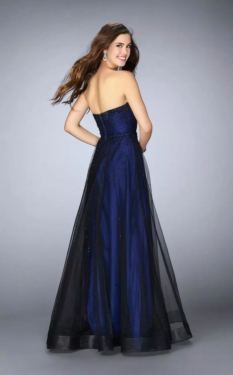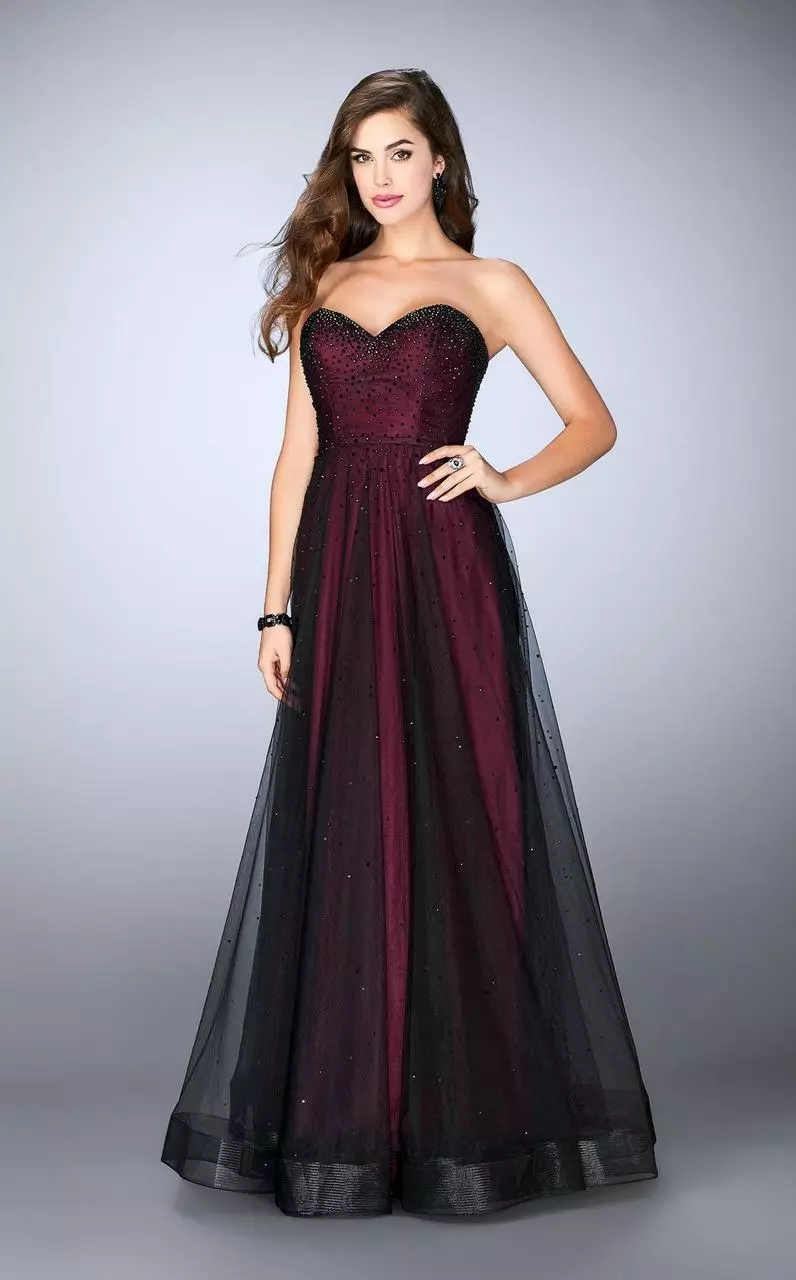 Make a breathtaking impression in this gorgeously iridescent ethereal wonder by La Femme 23723. This exquisitely sheer piece flaunts a tulle fabric overlay with sparkling ebony rhinestones along the sweetheart neckline, and cascading down the skirt. This stunner also features a full-length hem and a back zipper closure. Twirl your night away with grace and class in this luminous creation by La Femme.