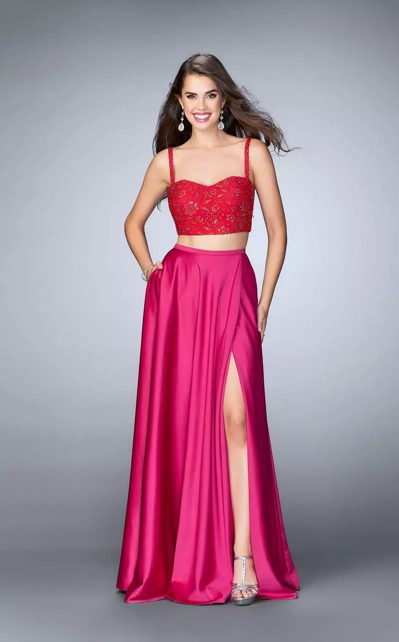 Turn yourself into a head-turning beauty by slipping into this absolutely eye-catching dress by La Femme 24159. Charismatic A-line two piece dress with a satin skirt and lace top. Features an envelope side slit and pockets. Back zipper closure. Be ready to enthrall the night in this evening gown by La Femme.