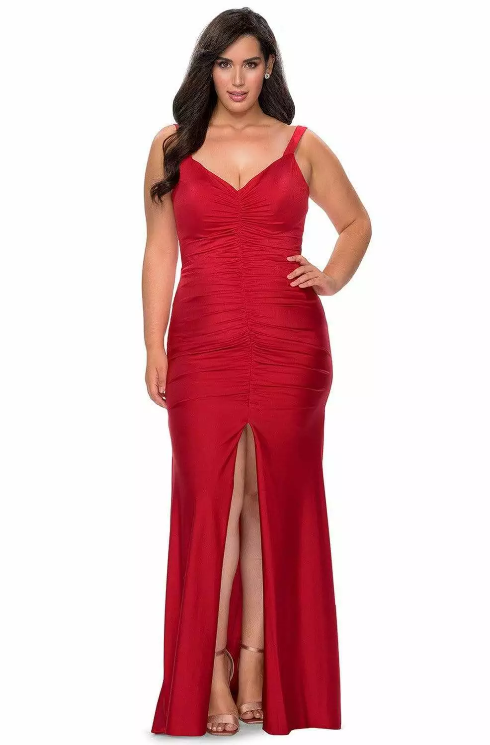Light up the night in this eye-catching dress by La Femme 29027. This jersey dress delights in a sleeveless, V-neckline with thin straps. The ruched bodice flatters your figure while the trumpet skirt is detailed with a high slit and a sweep train finish. Have fun in this fashionable La Femme dress.