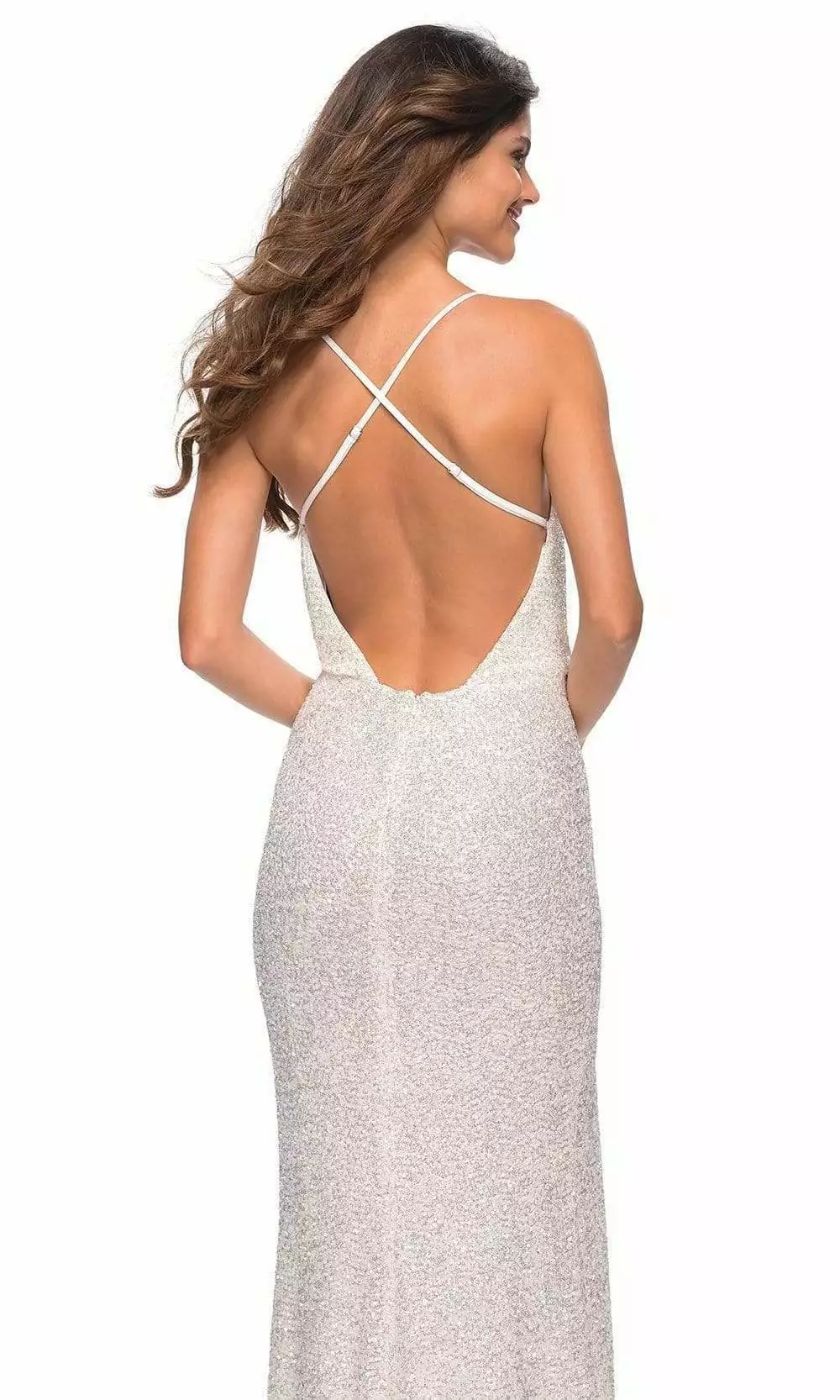 Be the definition of feminine flair in this La Femme 30376 creation. Styled with sequins in a fitted silhouette, this gown flaunts a cowl neckline with spaghetti straps. Riddled with cross straps at the open back, the high slit skirt travels down into a train. Be engulfed with the sophistication of this La Femme masterpiece. Models are wearing the Black and White colors.