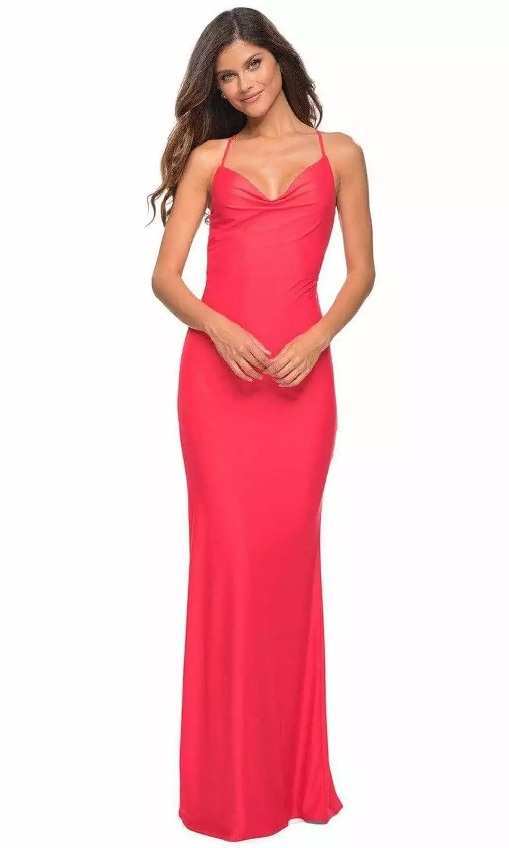 Embrace a style that is immaculately sultry as you glam up for your event in this cowl neck La Femme 30603. A daring open back is accented with thin crossed straps and ruching on the tailbone. A sheer panel adds extra spice to the thigh high side slit on the sheath silhouette. Model is wearing Hot Coral color.