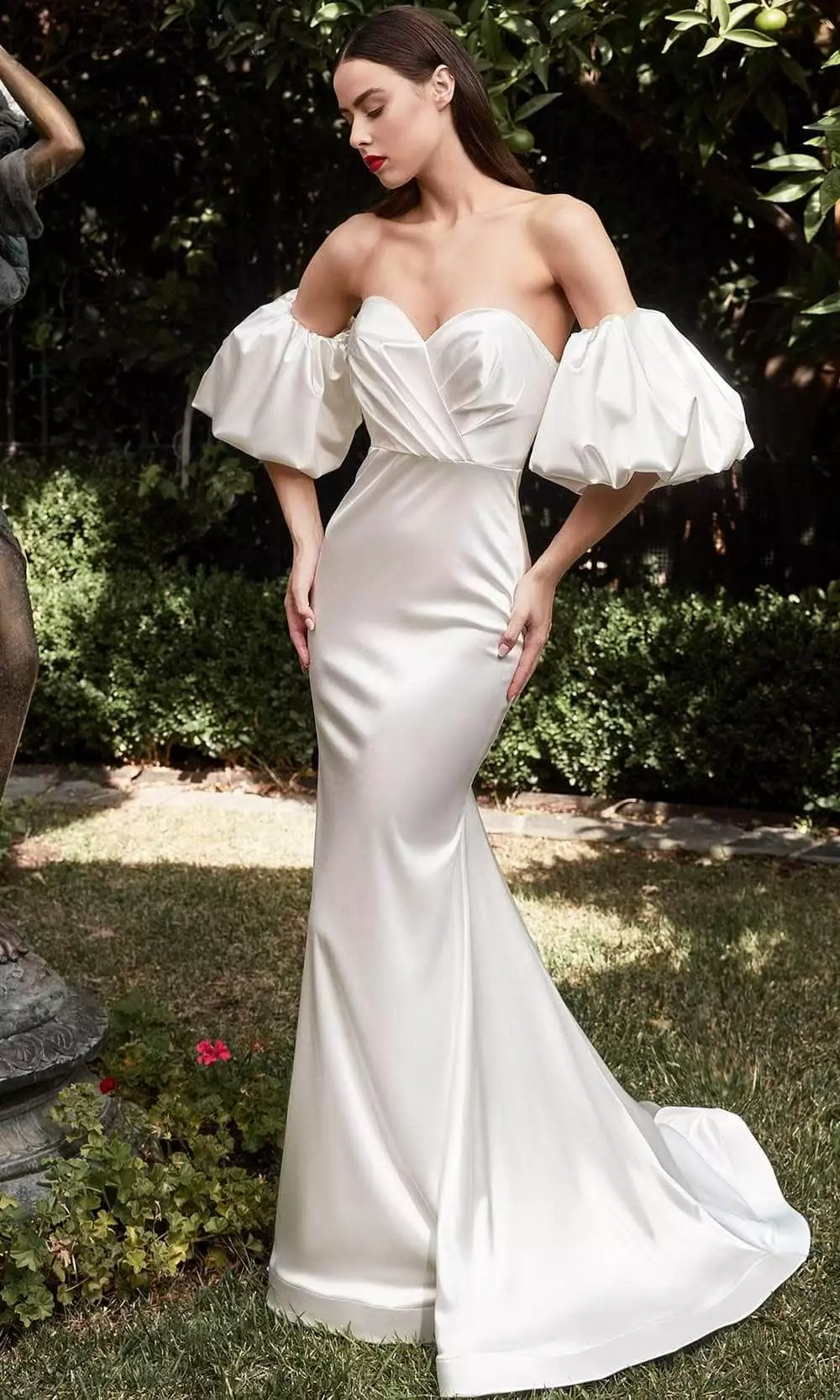 Weddings are full of emotion and joy, and it is completely possible to have your Ladivine CD984 dress embody those warm and fuzzy feelings. This simple yet bold gown charms with flawless seam line sculpted in fitted bodice, sweetheart neckline paired with big puffed sleeves, and cinch to show the natural waist. Going shopping for your wedding gown can be as intimidating as it is exciting but Ladevine bridal collection has you covered. You might consider this Ladivine CD984 if you really want to step outside the box with your ensemble. Model is wearing the White color.