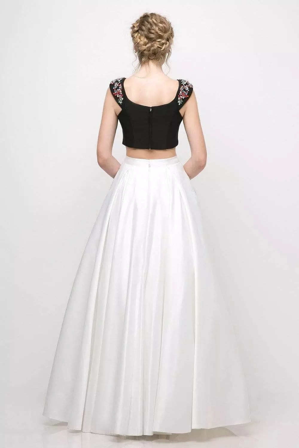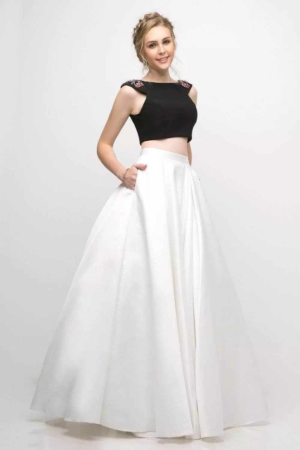 Everyone will be raving about how amazing you looked when you wear this extremely magnificent Ladivine CA316 work of art to the party. This stunning gown features an ebony bodice, beaded cap sleeves that can be converted into arm drapes, and a bateau neckline with a scoop open back. The vibrantly colored A-line skirt has pockets in the inseam and extends all the way to the hem. Slip into this Ladivine CA316 masterpiece for a stunning pose. The model is wearing the Black and White color.
