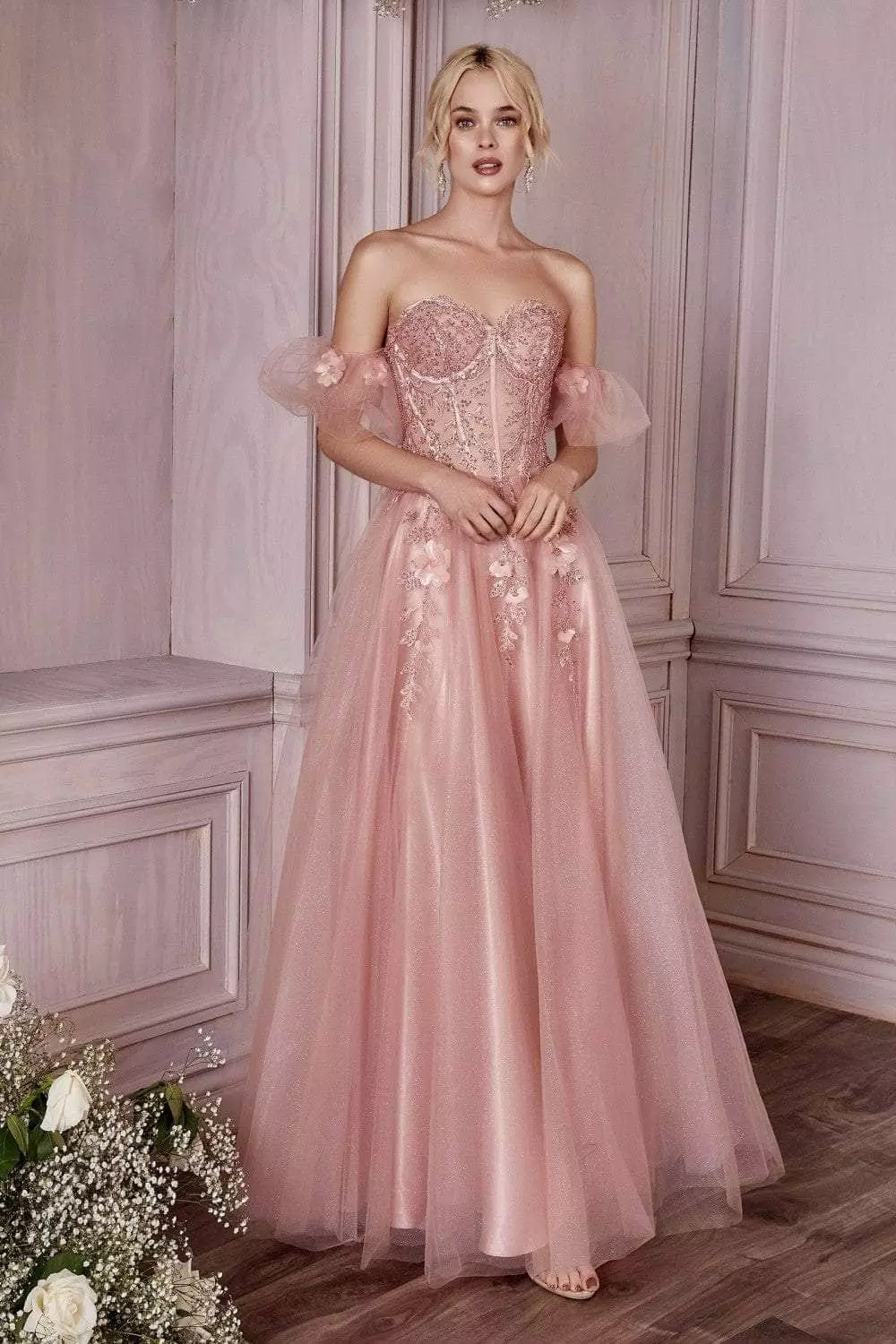 Envision the ideal evening in this evocative formal gown by Ladivine CD0191 creation. This stunning gown features floral lace appliques and beadwork on a sheer corset bodice, a sweetheart neckline, and detachable puff sleeves. The glittering A line skirt flowed with blossoms and beadwork and traversed to the floor with a train. This stunning Ladivine masterpiece will sweep them off their feet. Bring beauty, romance and glamour to your big day with Ladivine CD0191.The models are wearing the Blush, Burgundy, Champagne, Lilac, and Smoky Blue color. Find more Floral Dresses for Women.