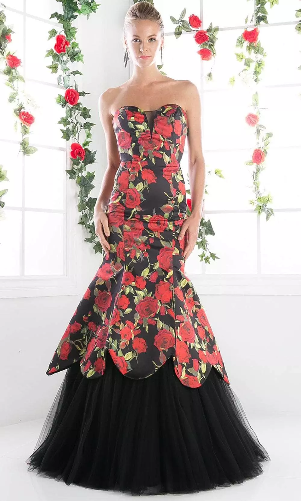 Wearing this Ladivine CR760 gown, you can stand out among those who want to look their best. This floral printed evening gown to flaunt your hourglass figure. It features a strapless sweetheart neckline on a fitted bodice and a classic lace up tie closure. This gown features a scalloped hem and an underskirt made of thick tulle fabric. Make your delectable appearance irresistible to look at by wearing this Ladivine CR760. The model is wearing the Print color.