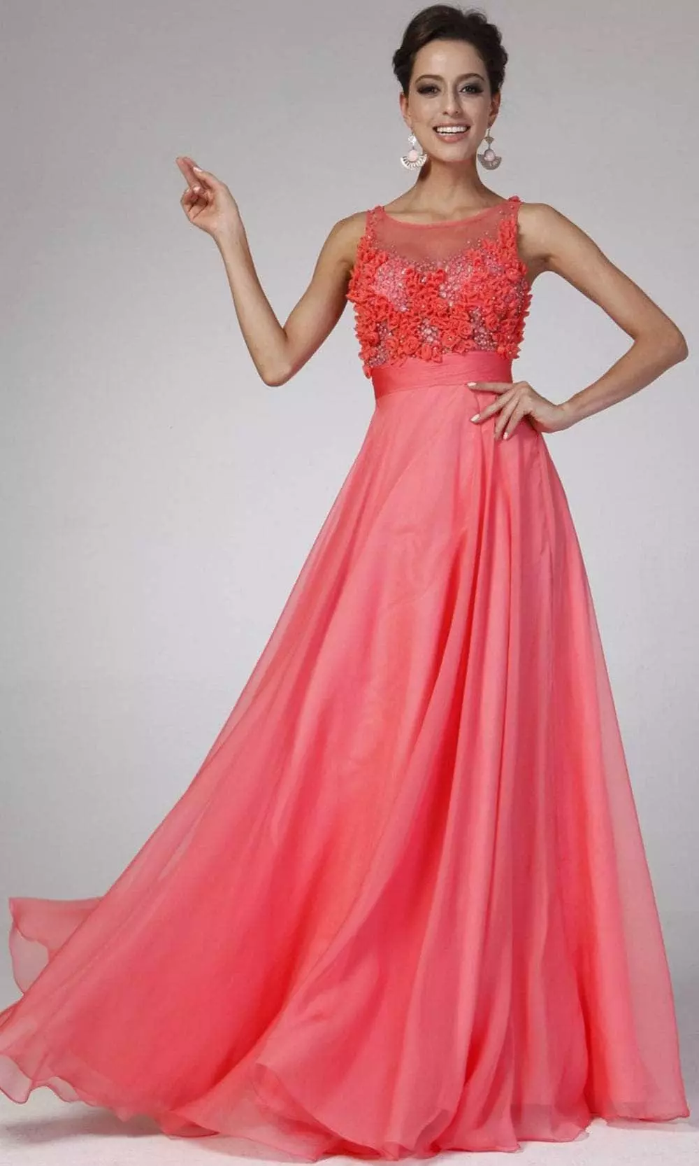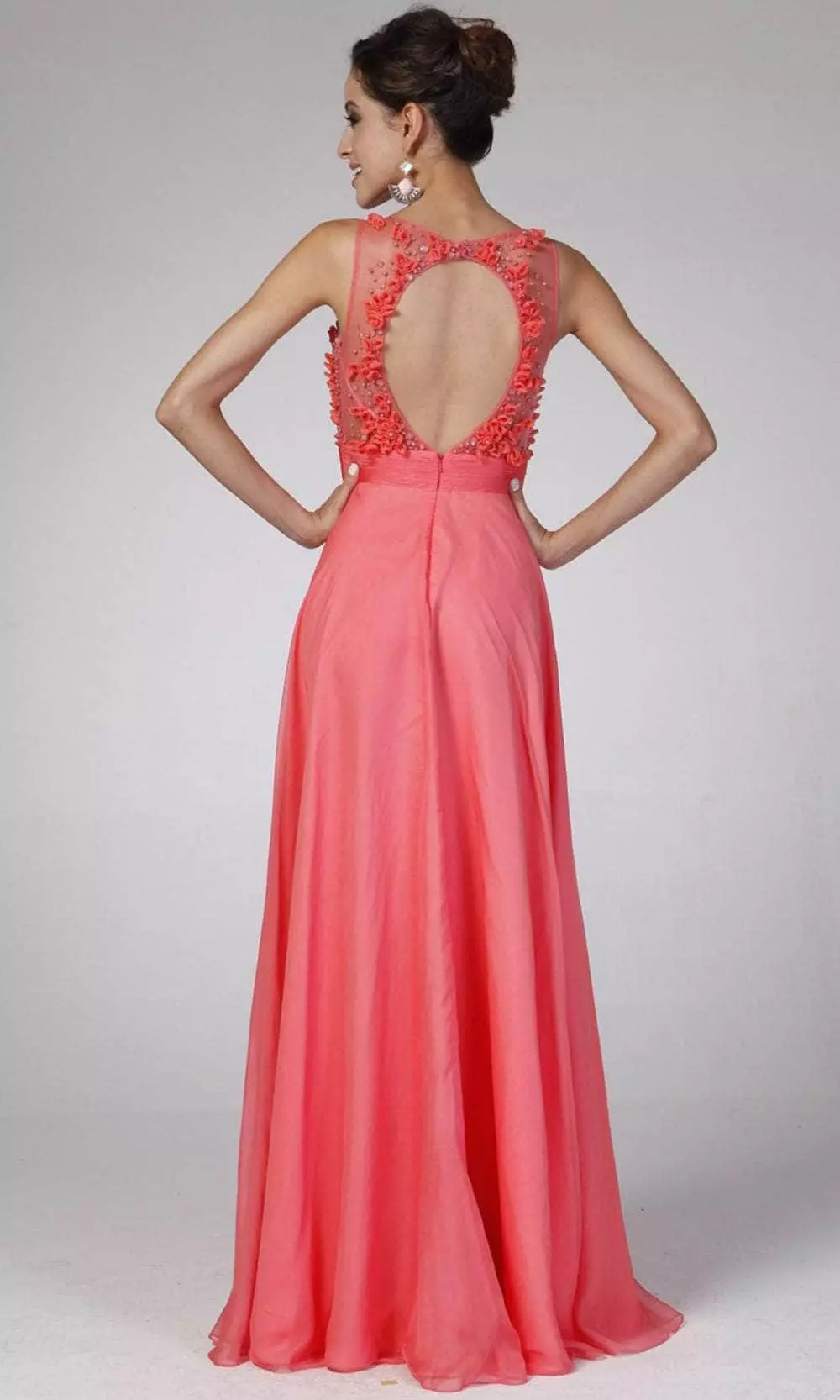 Be the center of attention on your next formal occasion in this evening dress from Ladivine JC4148. The illusion neckline of this dress is perfectly complemented by its floral-embellished bodice. Its empire waistline creates a perfect effect to elongate your lower body. Show off just enough skin with the keyhole back style. Glide like a goddess with an A-line skirt that flows naturally all the way down. This magnificent Ladivine JC4148 evening dress is perfect for your next formal event! The model is wearing the Coral color.