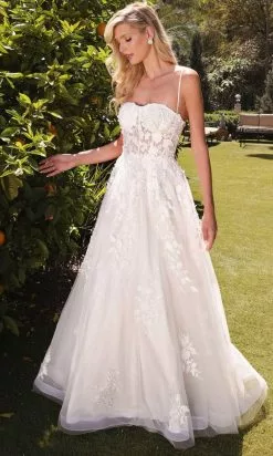Be a picture of perfection on your wedding day in this Ladivine TY15 Bridal Gown. This wedding dress is elegantly crafted with a bustier lace bodice, half sheer with visible boning and is held by spaghetti strap that crosses over at the partially open back. The romantic gowns voluminous tiered tulle skirt is supported by an opaque satin lining, while floral appliques give lovely finishing touches. This elegant Ladivine TY15 bridal gown will create the ideal memories of your destination wedding! Model is pictured wearing the Off-White color.