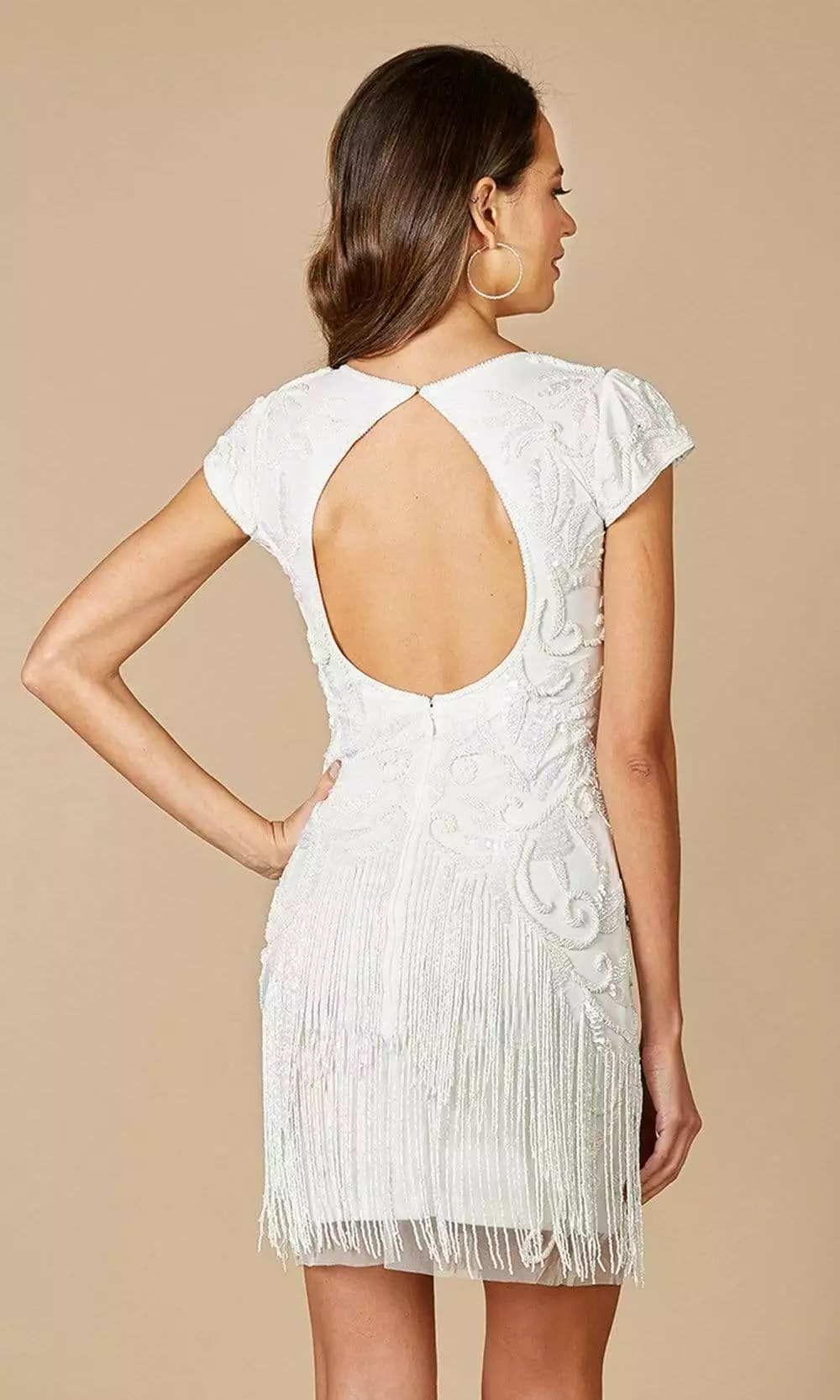 Wow everyone in this sophisticated Lara Dresses 51053 dress. This short dress highlights a modified V-neckline supported by cap sleeves in a beaded bodice with fringe on the skirt. Revealing a sheath silhouette, this also shows a back keyhole with back zipper closure. Flatter your figure with this Lara Dresses creation. Model is wearing Ivory color.