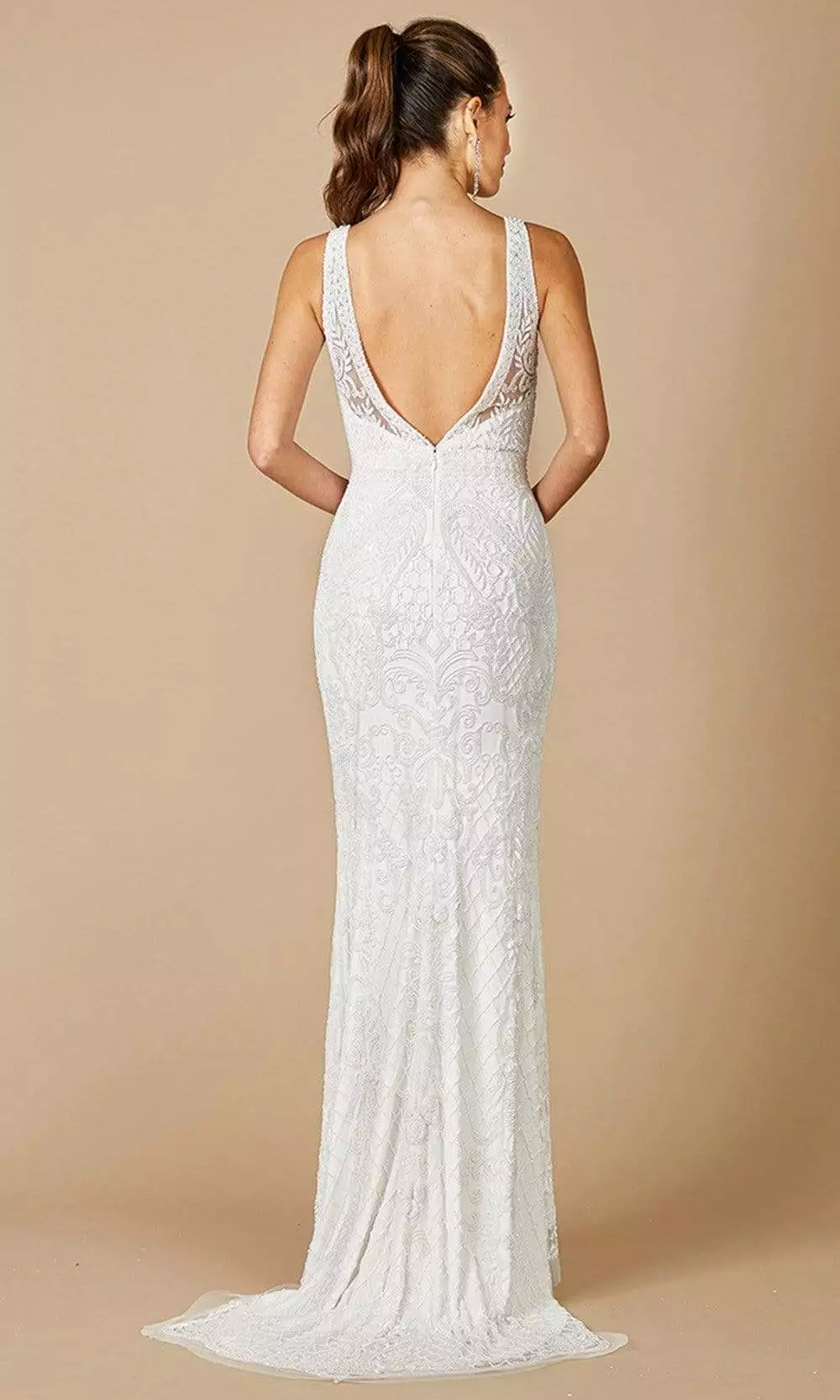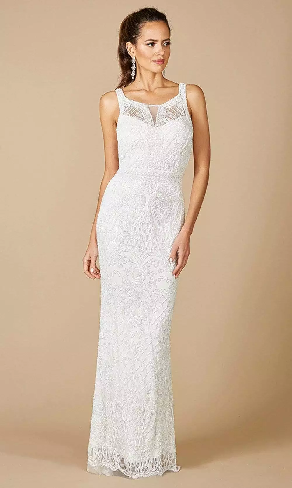 Enter the hall with grace and beauty in this Lara Dresses 51086 evening dress. This dress fashions an illusion straight neckline in a fitted laced bodice. The skirt reveals a sheath silhouette while the back shows a V back with back zipper closure. Appear in elegance in this this Lara Dresses creation. Model is wearing Ivory color.