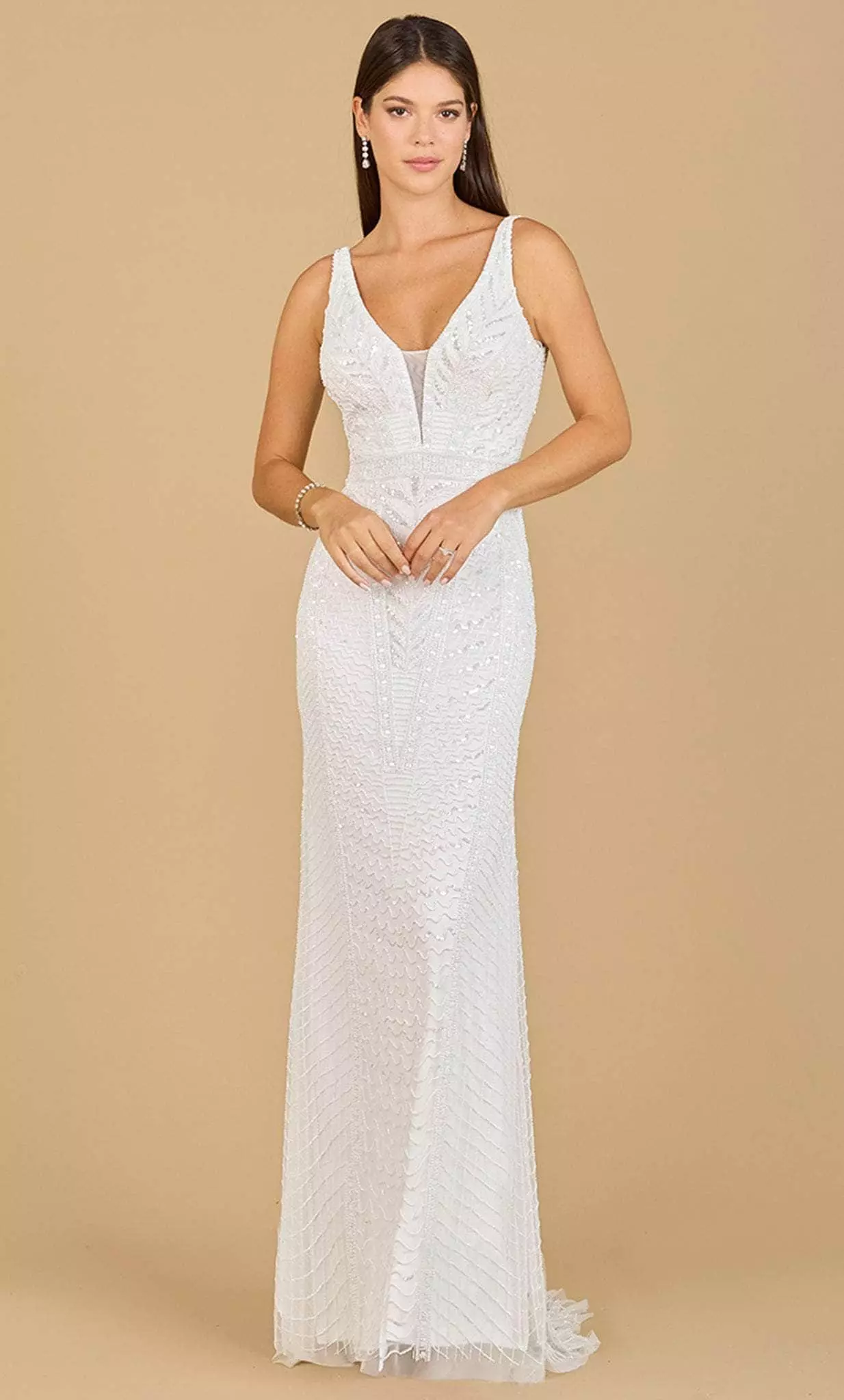 Exude a charm that is meant to mesmerize the elite crowd in this gorgeously decadent Lara Dresses 51147 creation. Featuring a sleeveless, V-neckline secured by supporting straps that lead to an alluring open back, this piece is expertly crafted in stretch tulle with stunning beadwork all throughout. Accented with tailoring seams, the skirt flares softly to a sheath silhouette as it ends to a sweeping train finish. Be the ultimate Queen of the Night in this gorgeous Bridal dress from Lara Dresses 51147 creation. Model is wearing the Ivory color.