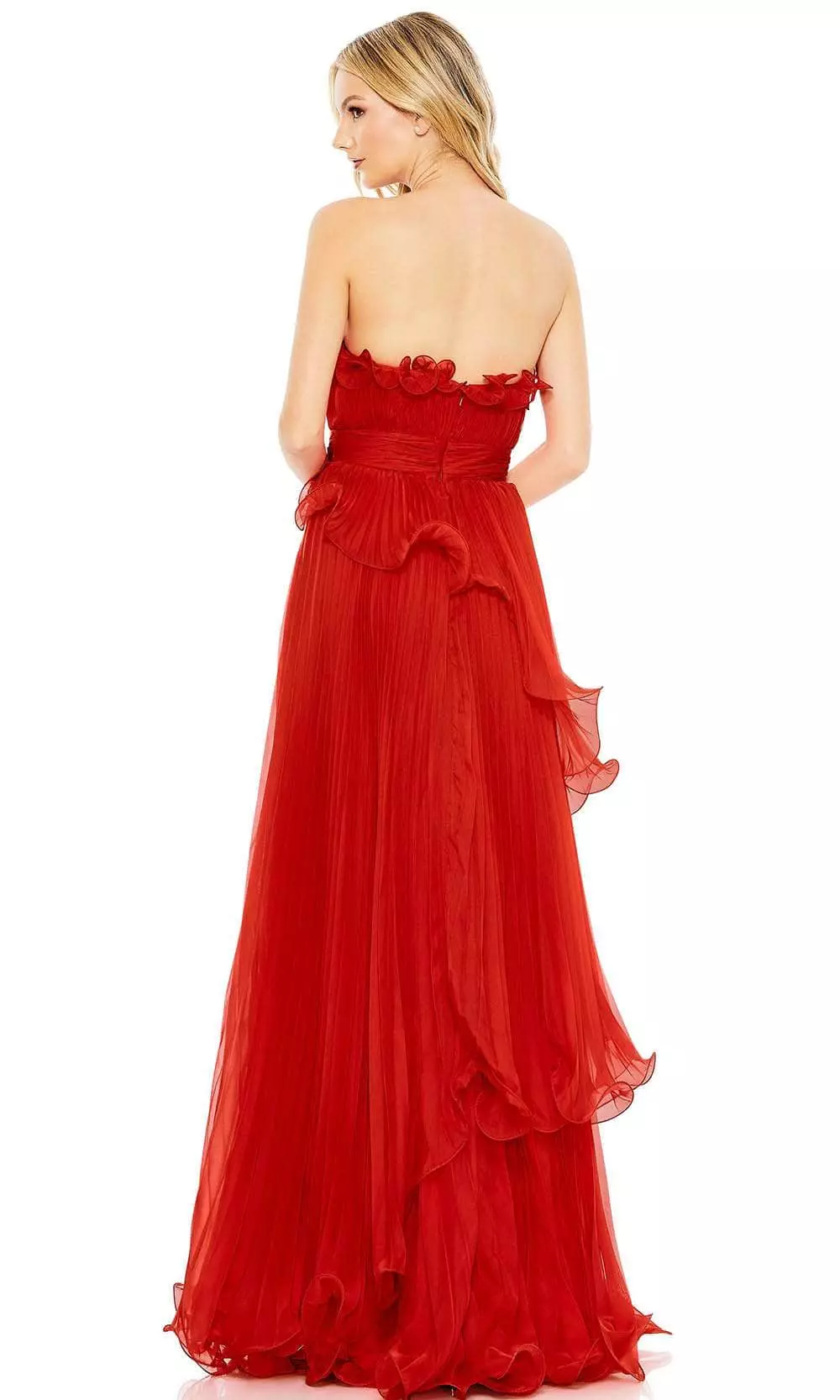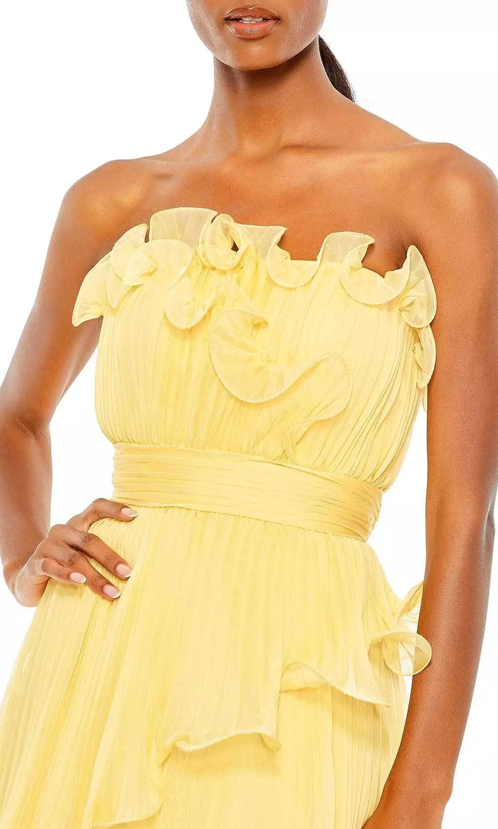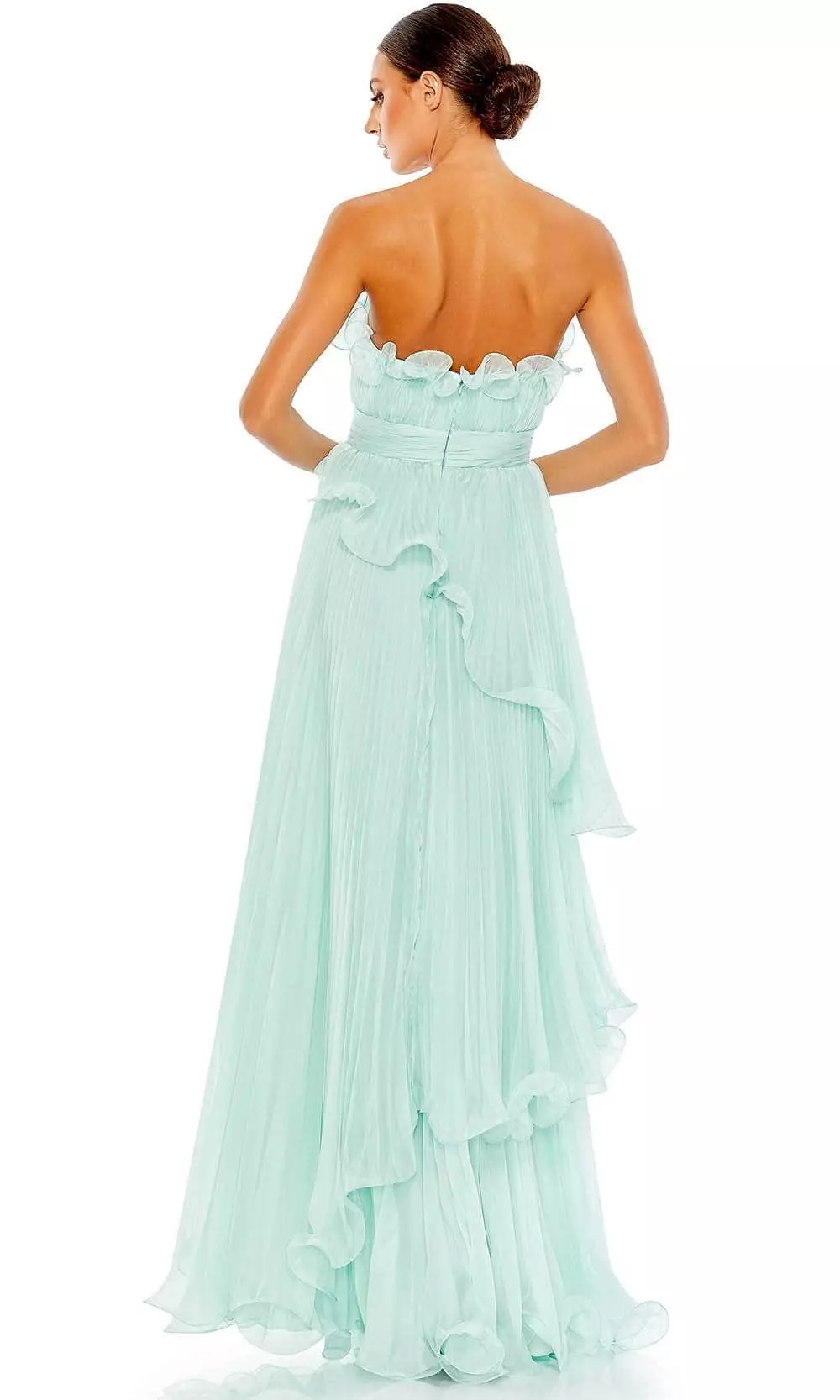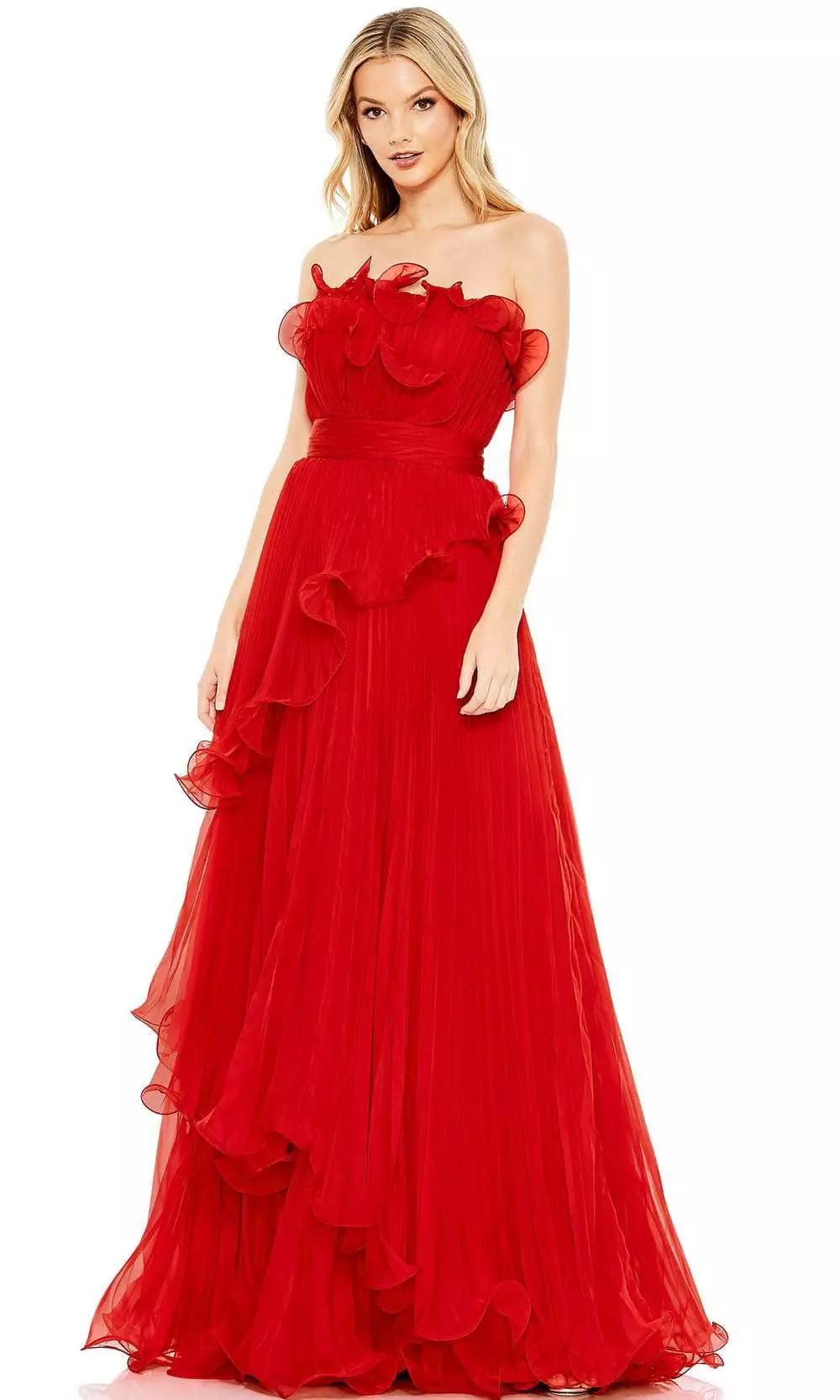 Make an extraordinary statement when you walk in this classy Mac Duggal 49537 creation. Lovely pleats and structured ruffle trim design this fit and flare outfit, this style makes you stand out from the crowd. The strapless bodice features a straight-across neckline and a mid-open back enclosed by a concealed zipper closure. Styled in asymmetrical tiered, the skirt creates an A-line silhouette that drops to the full-length hem and sweep train. Turn yourself into a timeless beautiful goddess in this prom gown by Mac Duggal 49537. Models are wearing the Buttercup, Mint and Red colors.
