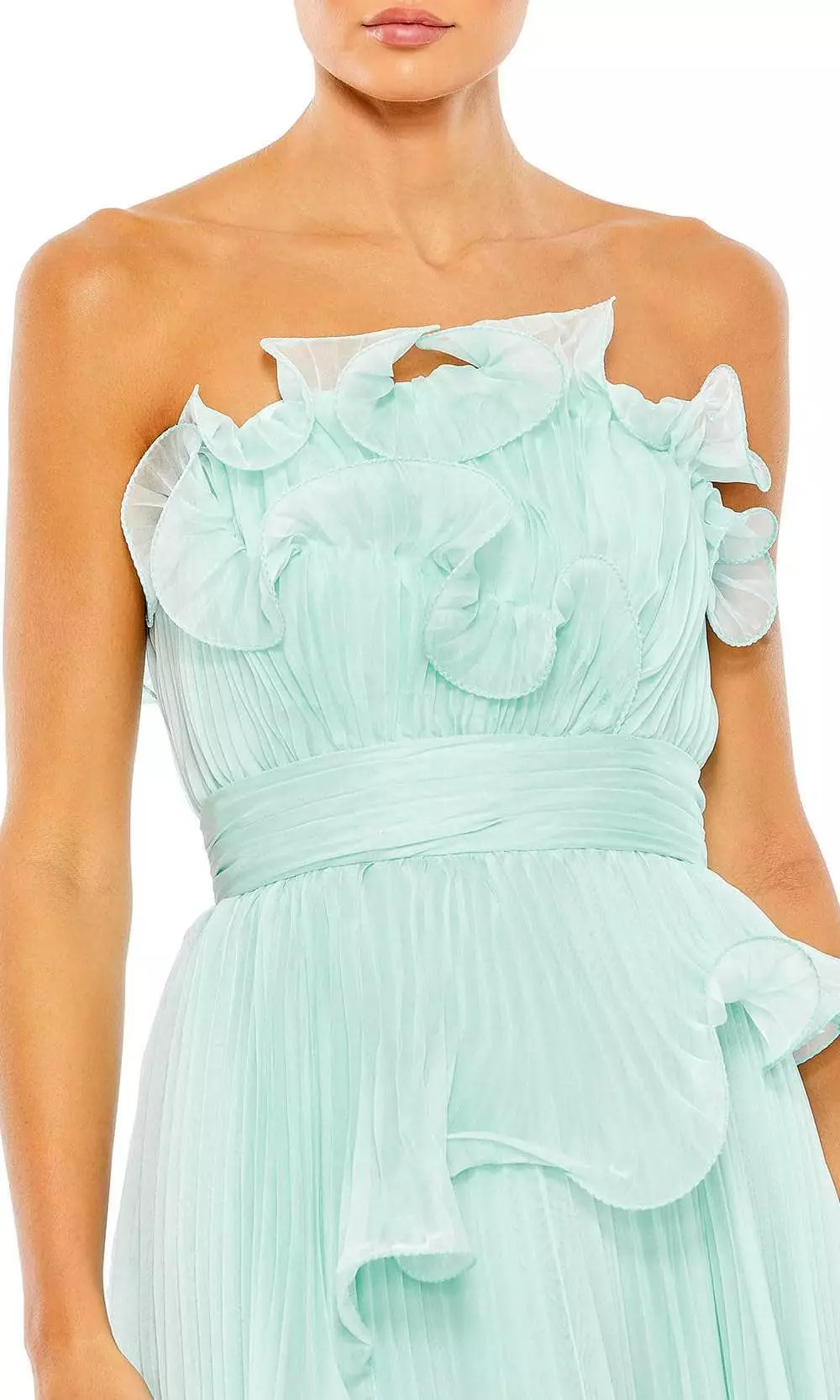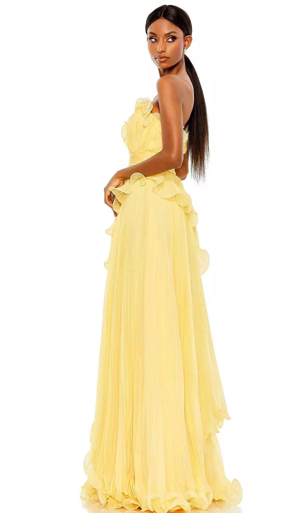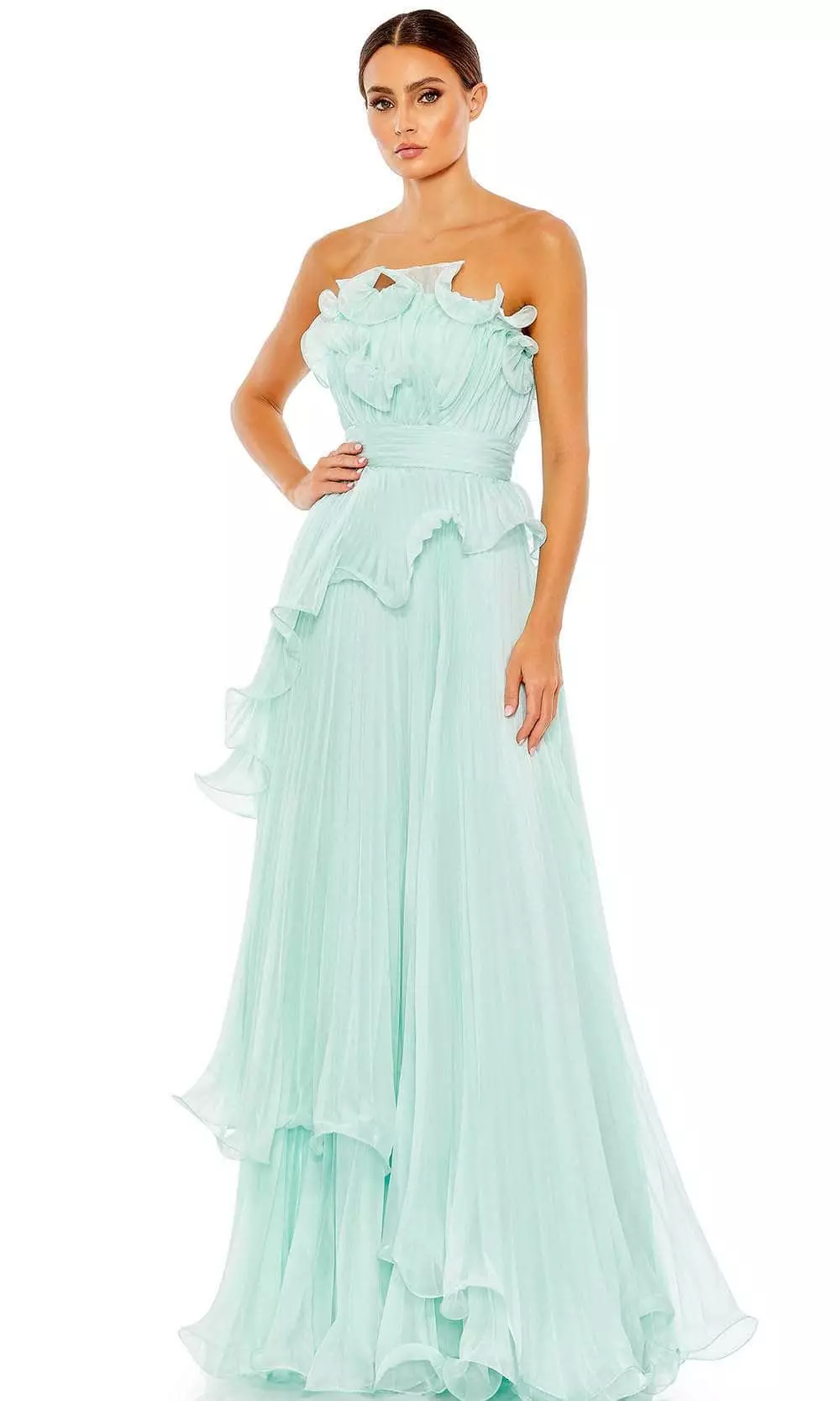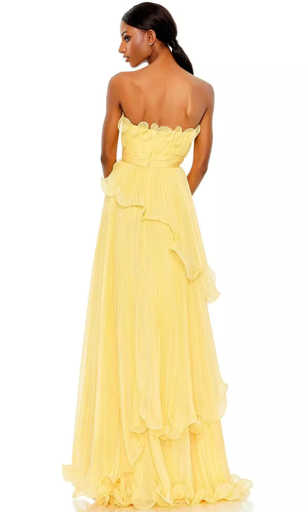 Make an extraordinary statement when you walk in this classy Mac Duggal 49537 creation. Lovely pleats and structured ruffle trim design this fit and flare outfit, this style makes you stand out from the crowd. The strapless bodice features a straight-across neckline and a mid-open back enclosed by a concealed zipper closure. Styled in asymmetrical tiered, the skirt creates an A-line silhouette that drops to the full-length hem and sweep train. Turn yourself into a timeless beautiful goddess in this prom gown by Mac Duggal 49537. Models are wearing the Buttercup, Mint and Red colors.