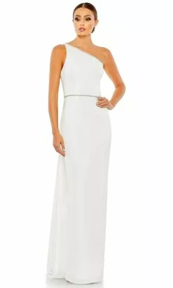 Start your night out right with a stylish creation from Mac Duggal49564. The lovely form-fitting dress is tailored from crepe fabric. It highlights a one-sleeve bodice with an asymmetrical neckline, complemented by a mid-open back that has a slanted strap detail. The skirt is accentuated with draping accents and cascades down to a floor-length column silhouette finished off with a sweeping train and a back slit that add flair to this beauty. Unleash an inner glamour that attracts all eyes to you in this Mac Duggal 49564 masterpiece. Model is wearing White color.