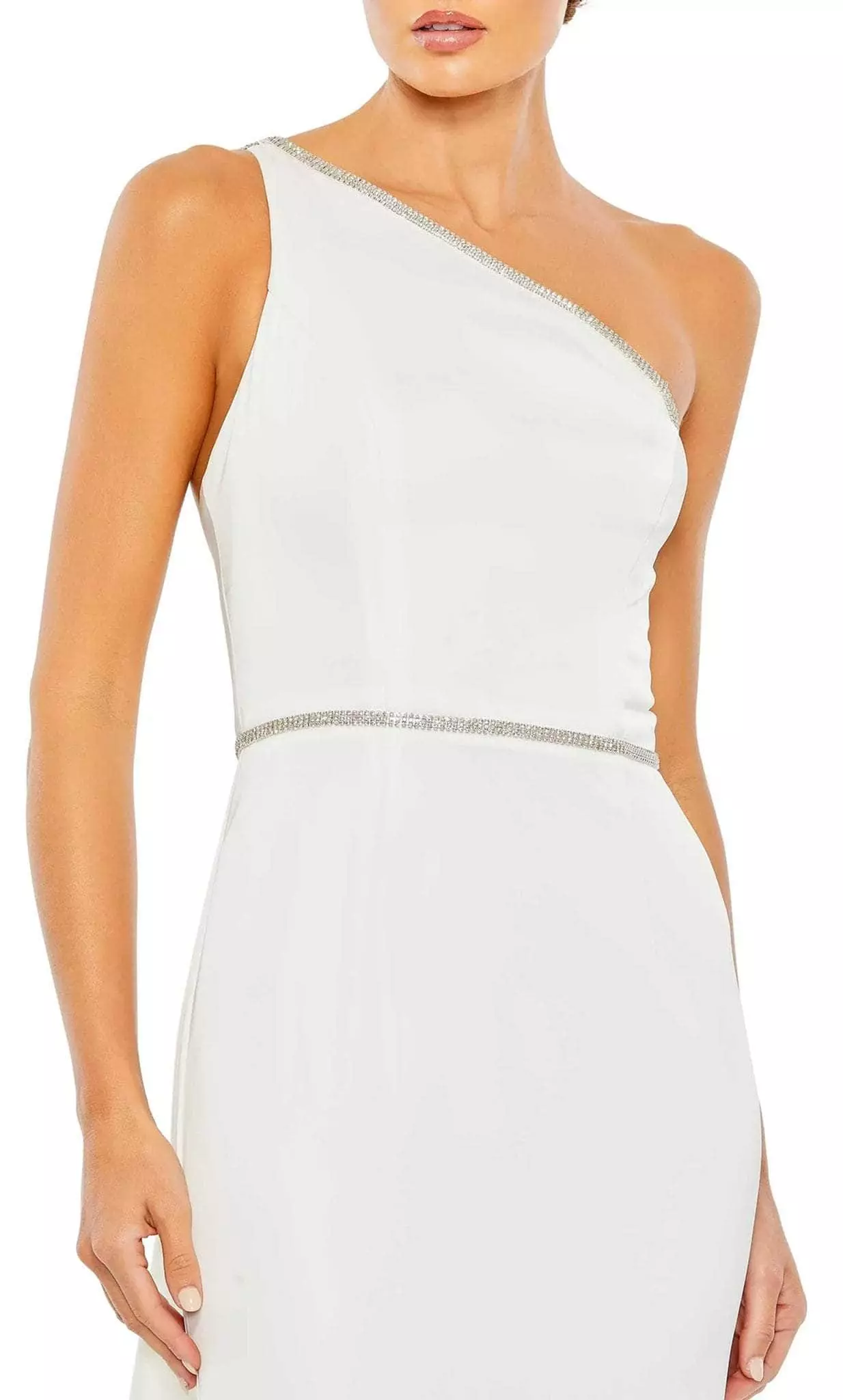 | Details: | One-shoulder, Rhinestone Embellished, Back Slit, Slanted Strap, Back Zipper Closure, Train |