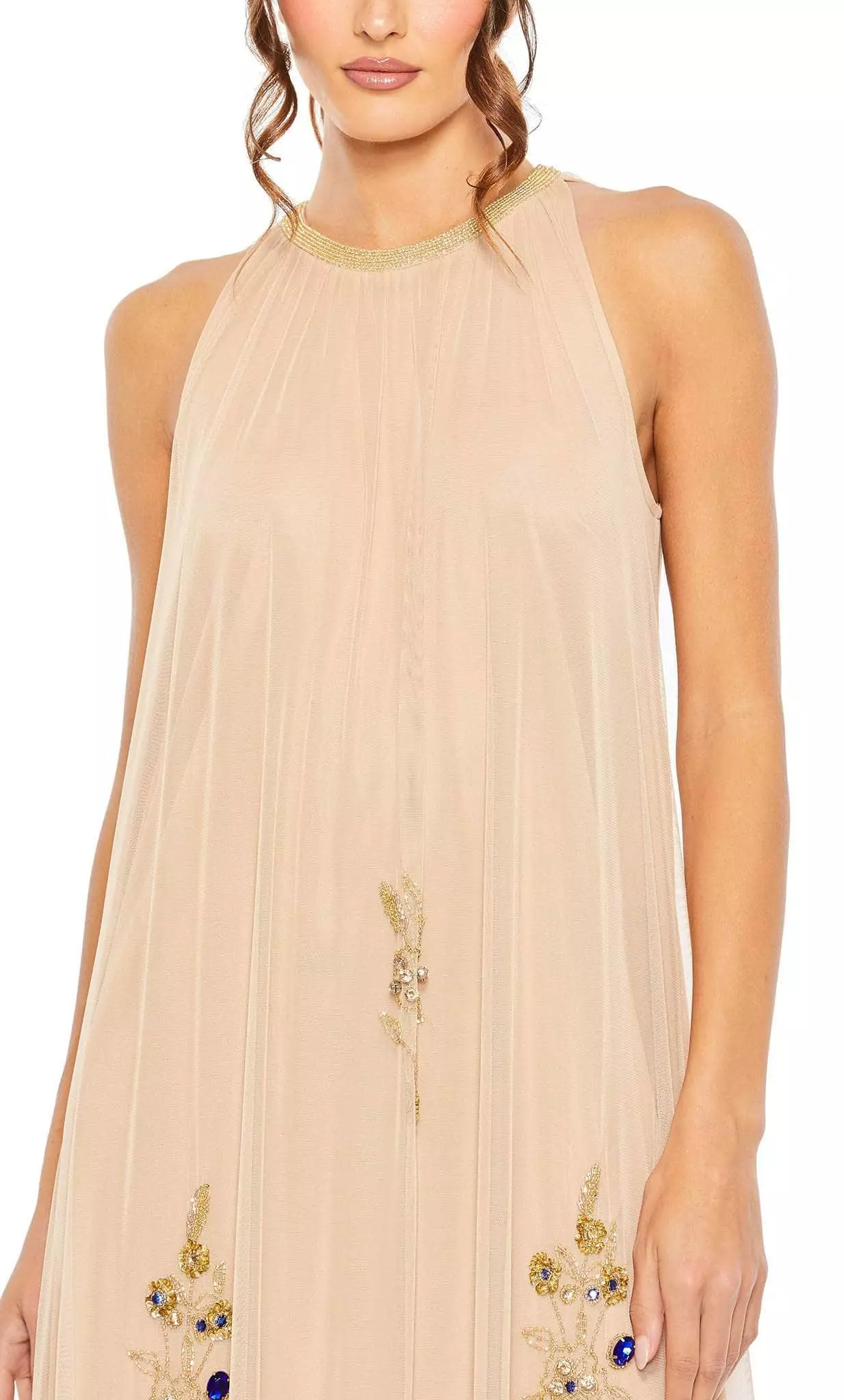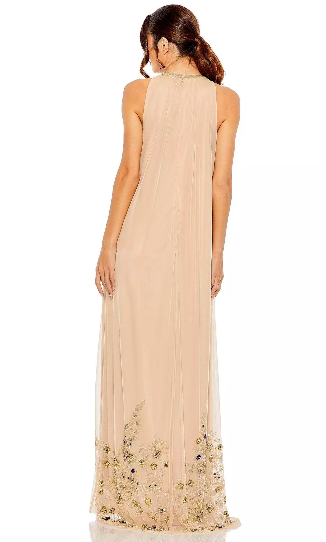 Impress the crowd with your charm as you wear this exquisite creation from Mac Duggal 9232. Featuring a sleeveless bodice, this gorgeous gown flaunts a beaded trim on the jewel neckline and a fully closed back. Stunning floral beadwork adds shine and glamour to this ensemble. Revealing a high low hemline, the flowy A-line skirt finishes in a slight sweep train. This Mac Duggal 9232 gown gives you an intricate look that will last a lifetime. Model is wearing the Nude Gold color.
