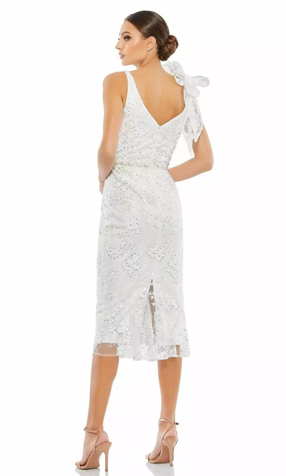 Be the spectacular belle on your next formal event in Mac Duggal 79337SC. Embellished with sequins and beads, this midi dress is cut in tea length. It is styled with a lace bow tie on one shoulder and features a plunging V neckline. Back zipper is used to close. This Mac Duggal is sure to make you the darling of the party!