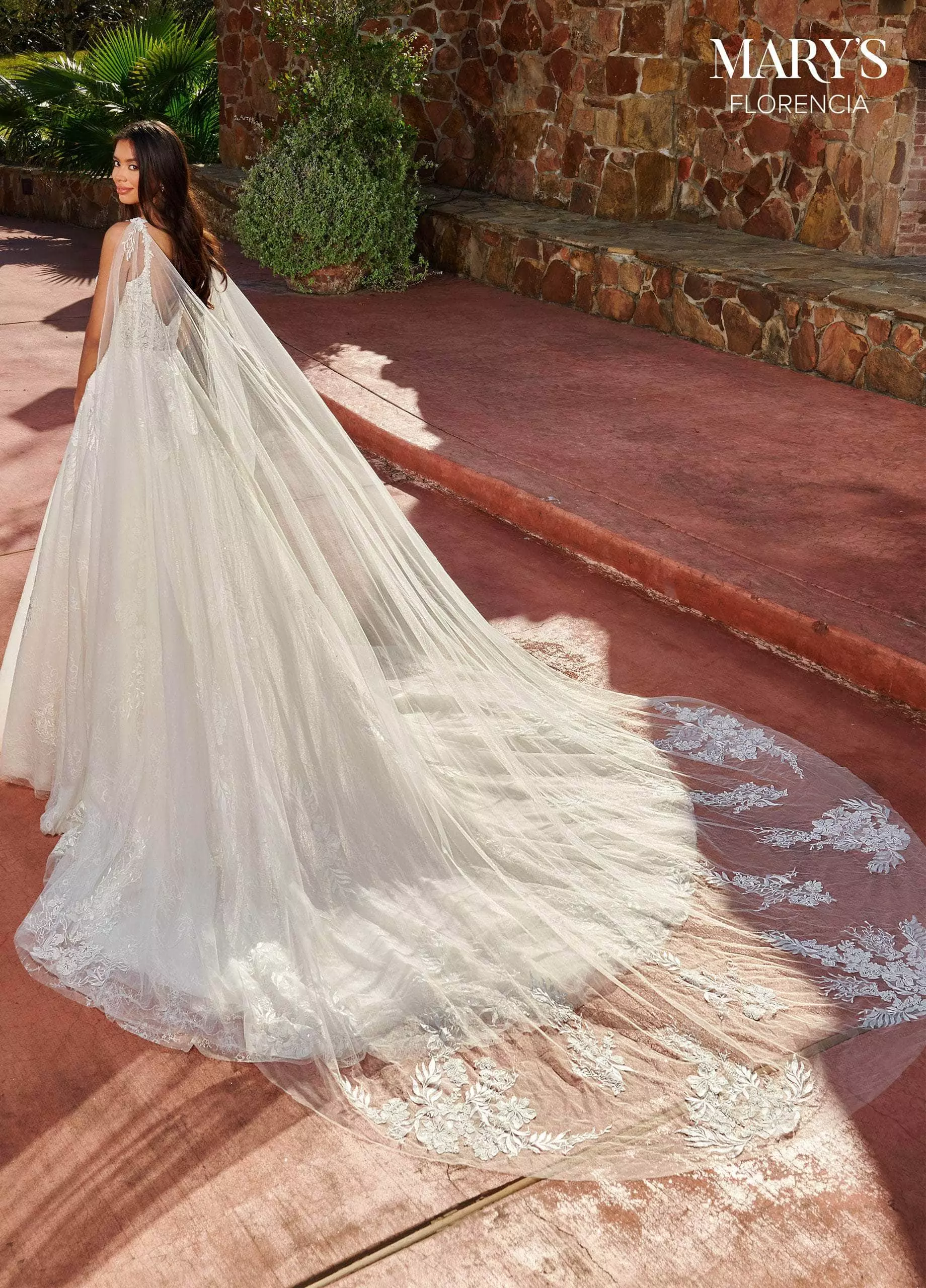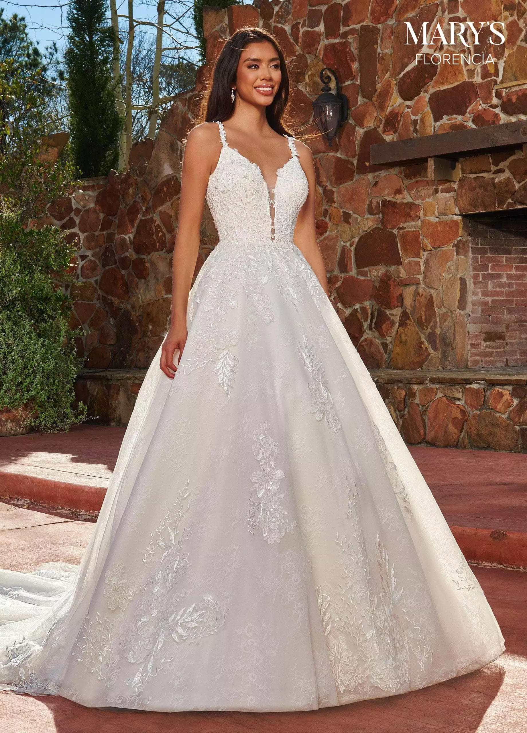Aspire to claim everyone’s hearts on your wedding day in this Mary’s Bridal MB3145 wedding dress. Impeccable floral lace appliques with bead details ornate this stunning ensemble. Tailored in a plunging V-neckline with illusion inset, this beauty stands out in a sleeveless fitted bodice and held by thin straps which leads to a low-cut scoop-shaped open back with a dramatic detachable sheer Watteau that trails down to a cathedral train. The A-line silhouette skirt gracefully streams down to a full-length hem and ends with a sweep train. Step through the chapel door and vows to forever in this stunning design from the Mary’s Bridal collection. Model is wearing the White color.